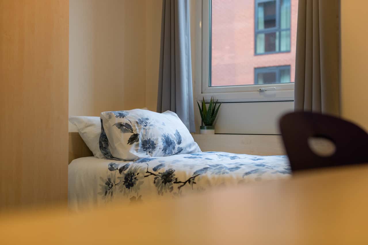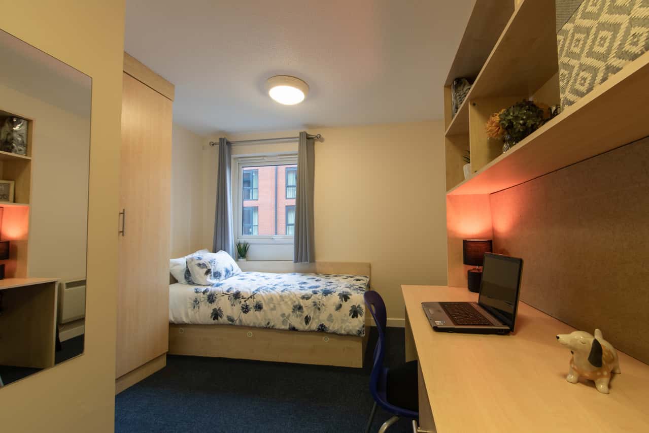 En-suite bedroom in a 6 bedroom flat with a small double Bed with under bed storage, study area - desk with desk draws, wardrobe, chair and full-length mirror. En-suite comprises of washbasin, mirror, toilet and shower cubicle. Sharing kitchen / communal area with cooker, fridge/freezer, microwave, kettle and table & chairs, sofa and TV - WIFI throughout