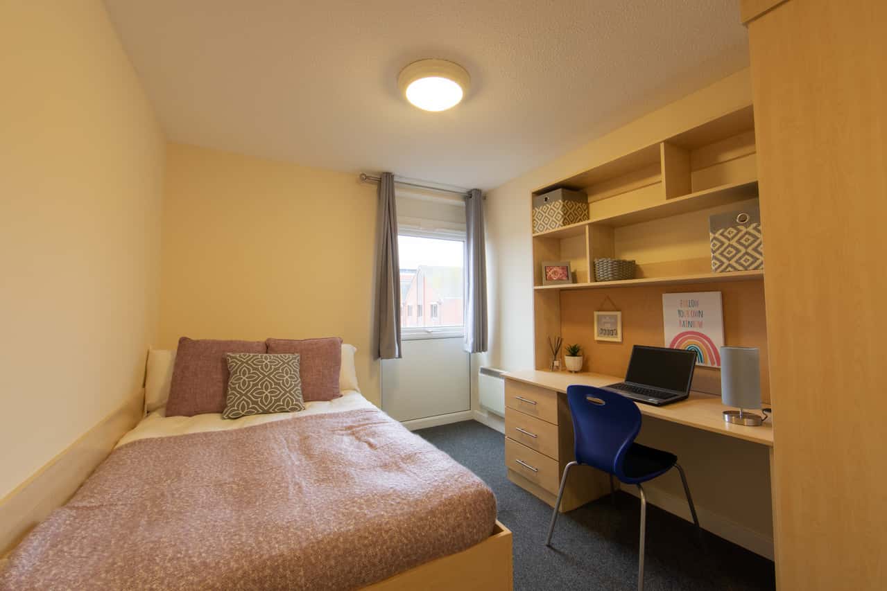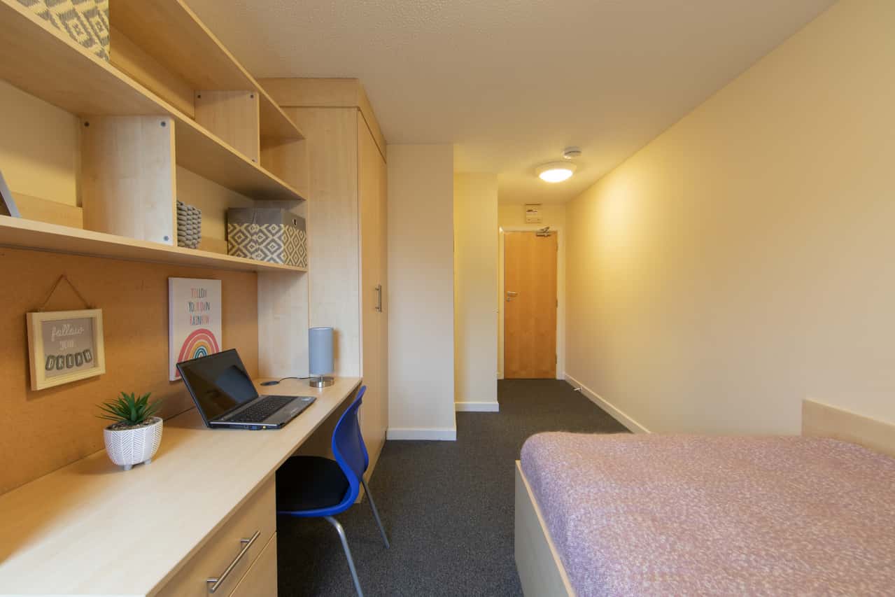En-suite bedroom in a 6 bedroom flat spacious room with a 3/4 Bed with under bed storage, study area - desk with desk draws, wardrobe, chair and full-length mirror. En-suite comprises of washbasin, mirror, toilet and shower cubicle. Please note there are variances on room sizes and layout. Sharing a kitchen / communal area with cooker, fridge/freezer, microwave, kettle and table & chairs, sofa and TV - WIFI throughout