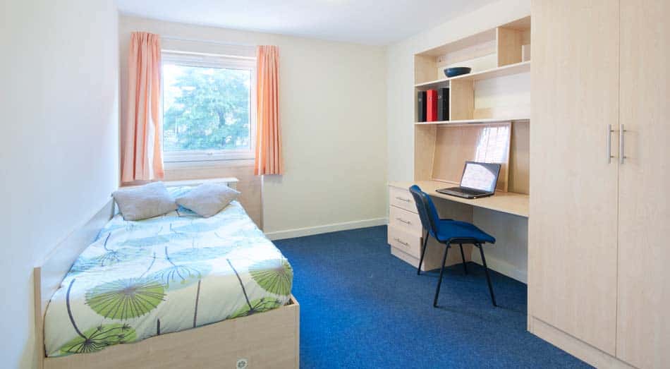 En-suite bedroom with view in a 6 bedroom flat spacious room with a 3/4 Bed with under bed storage, study area - desk with desk draws, wardrobe, chair and full-length mirror. En-suite comprises of washbasin, mirror, toilet and shower cubicle. Please note there are variances on room sizes and layout. The shared area includes a kitchen / communal area with cooker, fridge/freezer, microwave, kettle and table & chairs, sofa and TV - WIFI throughout