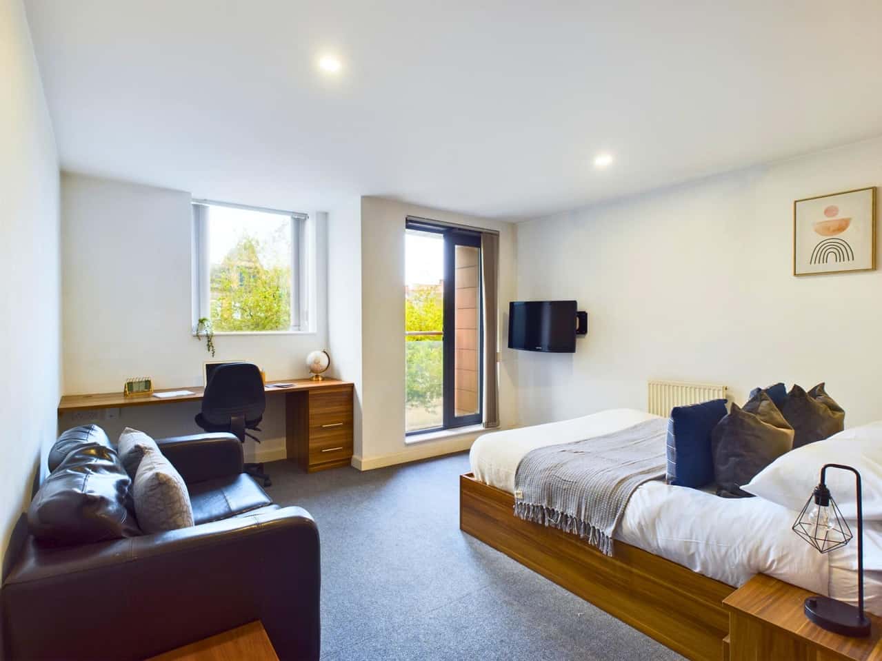 Double bed with double wardrobes and study area. Personal modern kitchen, bathroom, living area with a french balcony. Up to 100Mbps WIFI. Situated in the city centre.