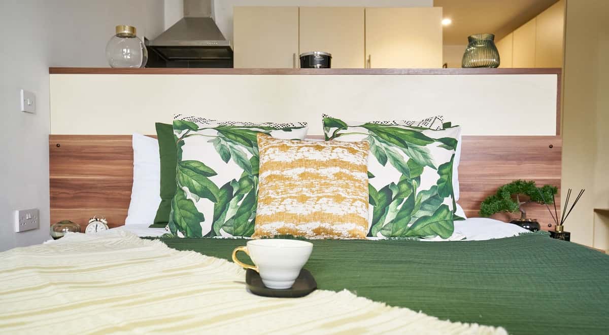 Double bed with double wardrobes and study area. Personal modern kitchen, bathroom. living area with a full sized balcony. Up to 100Mbps WIFI. Situated in the city centre.