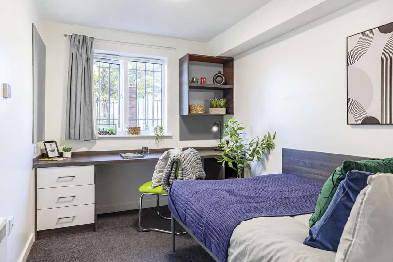 Choose our Classic Ensuite room for your own modern apartment featuring a comfy small double bed, a desk and chair, ensuite bathroom and ample storage space. You’ll also have access to a shared kitchen and living space with a breakfast bar, so you can host your own cooking nights. Keen to meet other students? Our outside courtyard area is perfect for relaxing on a sunny day. Book your room now for the next academic year!