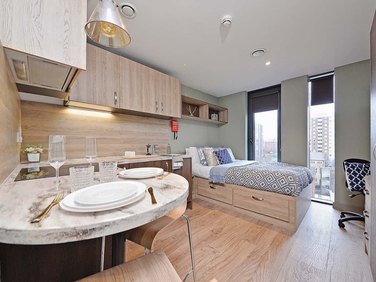 Relax in our 16.6m2 studio with a comfy small double bed, your very own 32” flat screen TV and a study desk. Enjoy the privacy of your own en suite bathroom, with plenty of space throughout the studio and a double wardrobe for your belongings. With a fully equipped state-of-the-art kitchenette, students can cook something delicious and enjoy it at their very own breakfast bar to start the day off right! The kitchenette includes a fridge (with ice box) a combination microwave and a 4-ring Induction Hob.