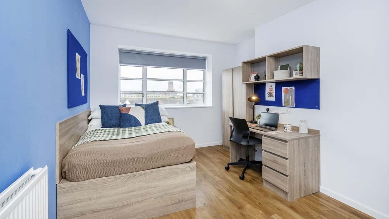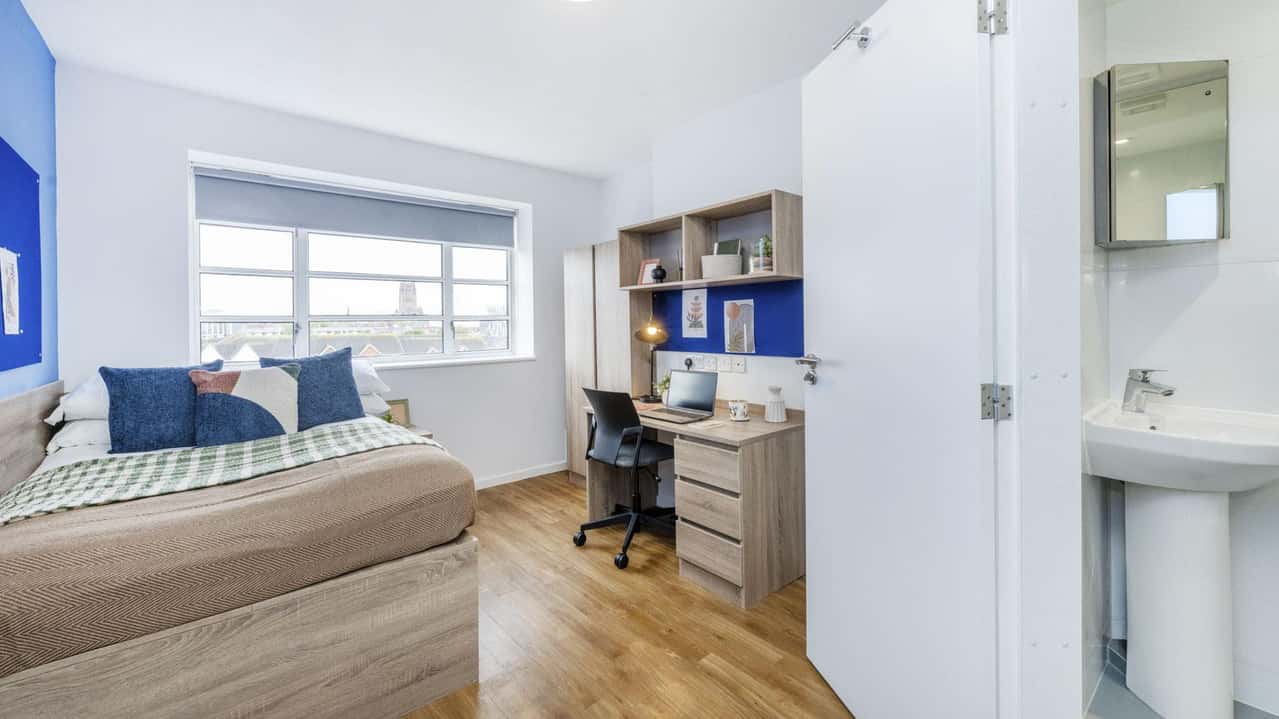 Our newly refurbished Ensuite Plus room measures 12 sqm comes equipped with a 3/4 bed with storage in a 3-5 bed cluster flat. With a shared kitchen area and breakfast bar so you can get to know your flatmates. This style features an en-suite bathroom so you can take as many long showers as you want. You’ll have a wardrobe, desk and study chair, shelf space, a bedside table and large windows letting in lots of daylight. It’s the ultimate study space so you can crack on with any uni work!