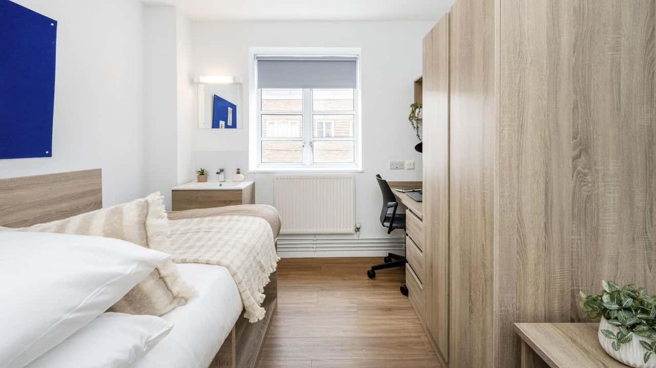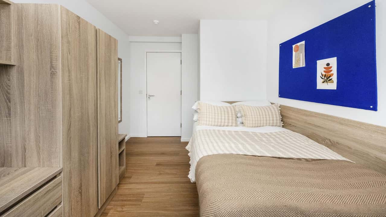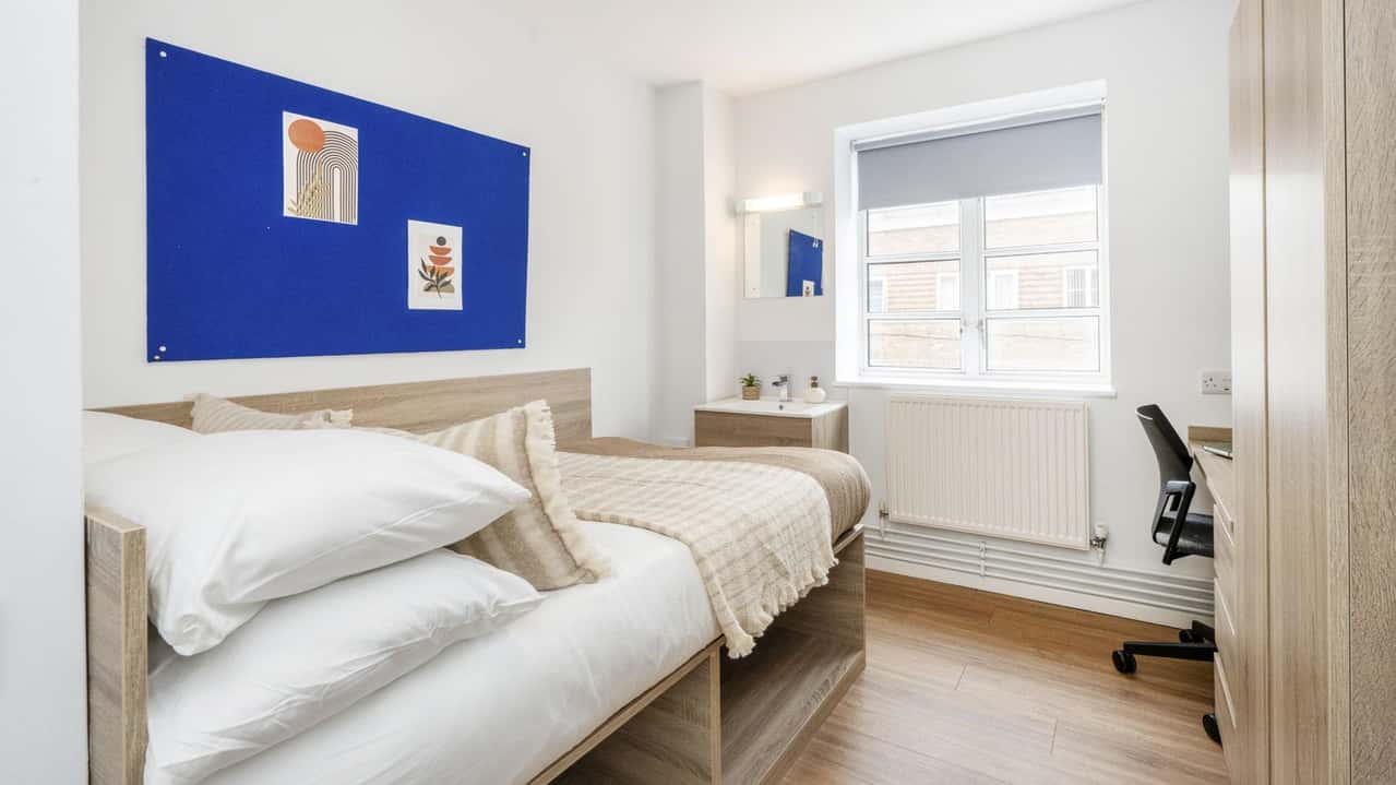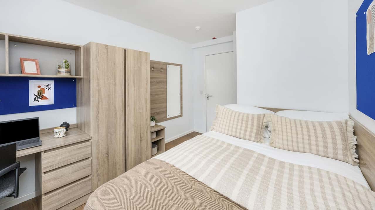 Our newly refurbished Ensuite room style measures 12.5sqm and come complete with a 3/4 bed (with the exception of 306A and 406A which contain single beds) with storage in a 3-5 bed cluster flat. You will share a kitchen area with breakfast bar with your flatmates – did someone say games night?! You’ll have your own en-suite bathroom so forget about having to queue for a shower. Your room also features a wardrobe, desk and study chair, tons of shelf space, bedside table and large windows offering great views of Liverpool City Centre. When it's time to head out of your room, enjoy the common room and games room or attend one of our busy social events that take place across the year.