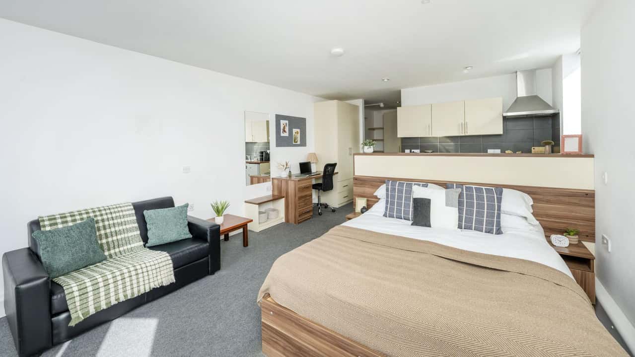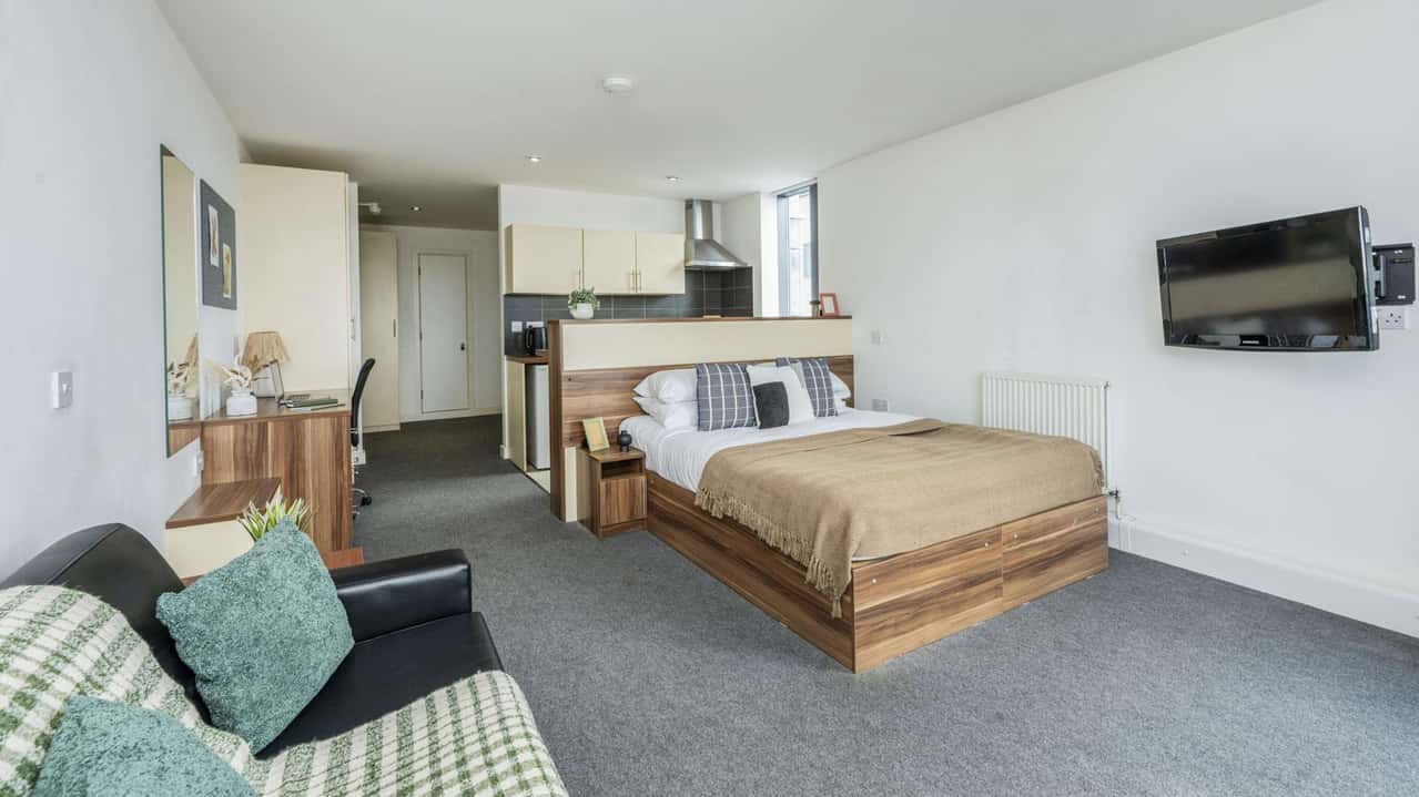 Double bed with double wardrobes and study area. Personal modern kitchen, bathroom, living area with a french balcony. Up to 100Mbps WIFI. Situated in the city centre.