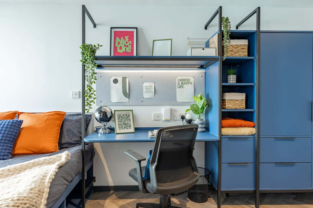 Our Platinum Accessible Suite offers a spacious 24m2 by 28m2 and is crafted for students who prioritise both comfort and accessibility. Available on floors 0-6, this suite features a double bed with storage, study desk and chair, wardrobe, pin board, full-length mirror, and a private wet room for easy accessibility. The kitchen area is fitted with a 2-ring electric hob, microwave, fridge freezer, and breakfast bar, offering all you need for a convenient lifestyle.