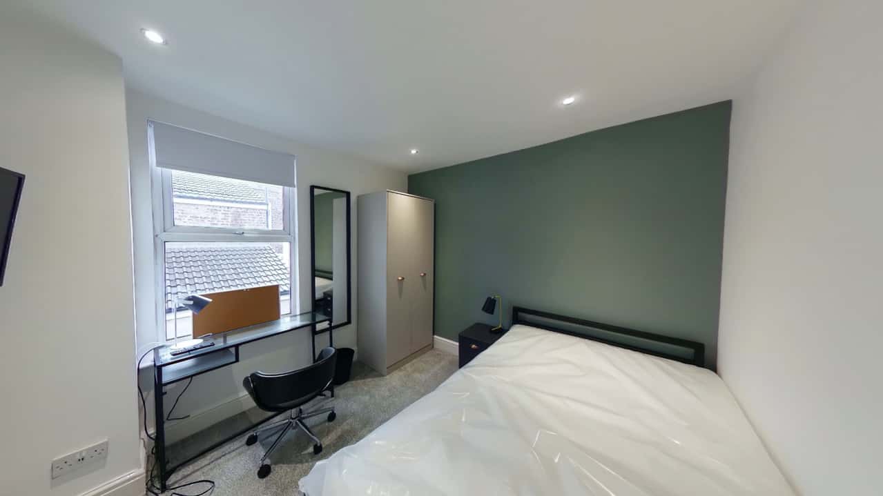 Situated in the vibrant Kensington Fields, this stylish property offers four double bedrooms complete with desks, comfy chairs, and ample storage, alongside a modern bathroom.