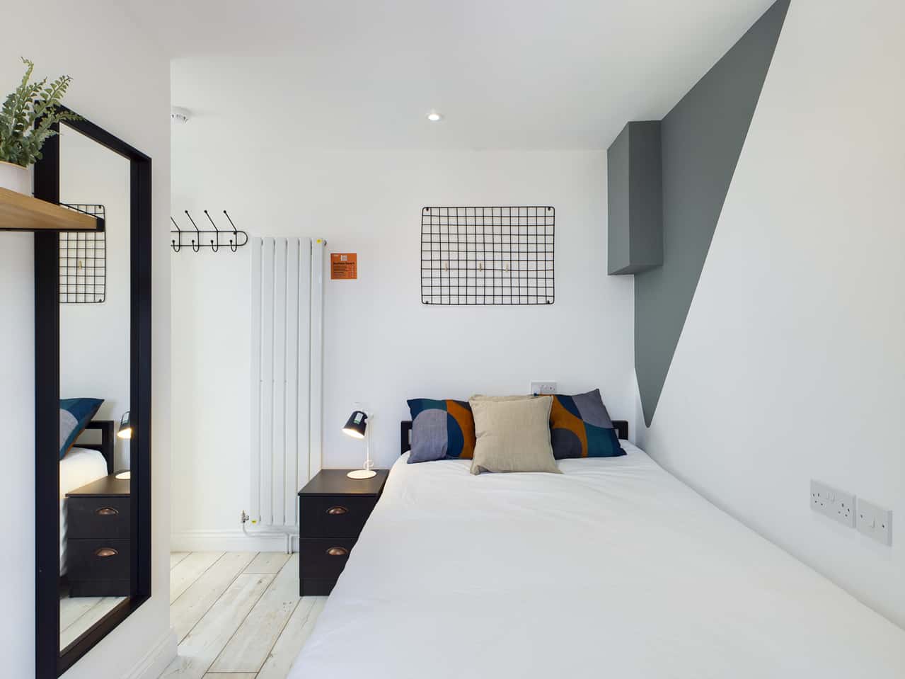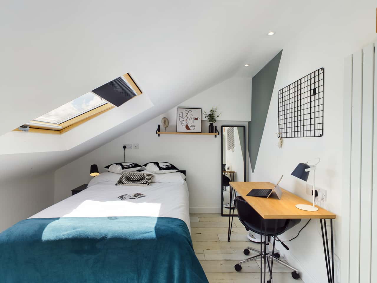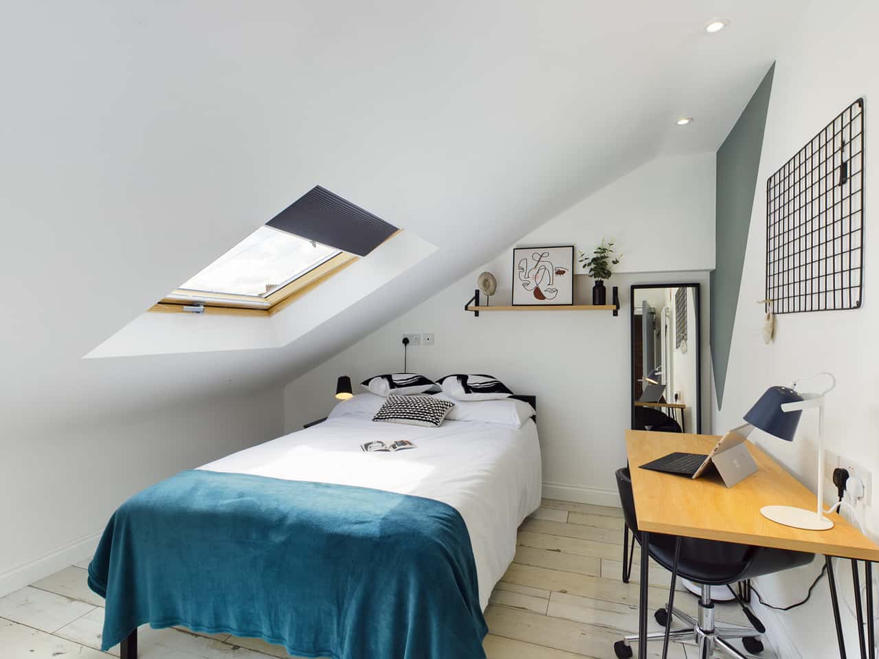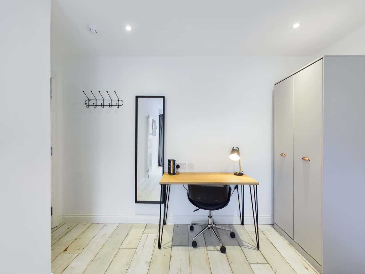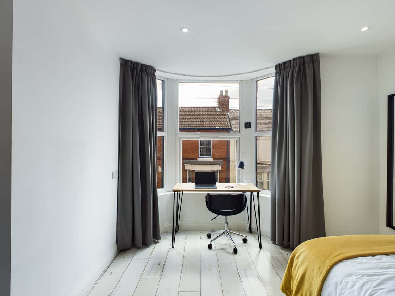 This stylishly refurbished property, offers seven double bedrooms, each with desks, comfortable chairs, and ample storage, alongside two modern bathrooms. The chic living room features spacious sofas and a large flat-screen TV, perfect for socializing, complemented by a large dining table for communal meals. The kitchen is equipped with modern appliances, multiple fridges, and a washing machine.