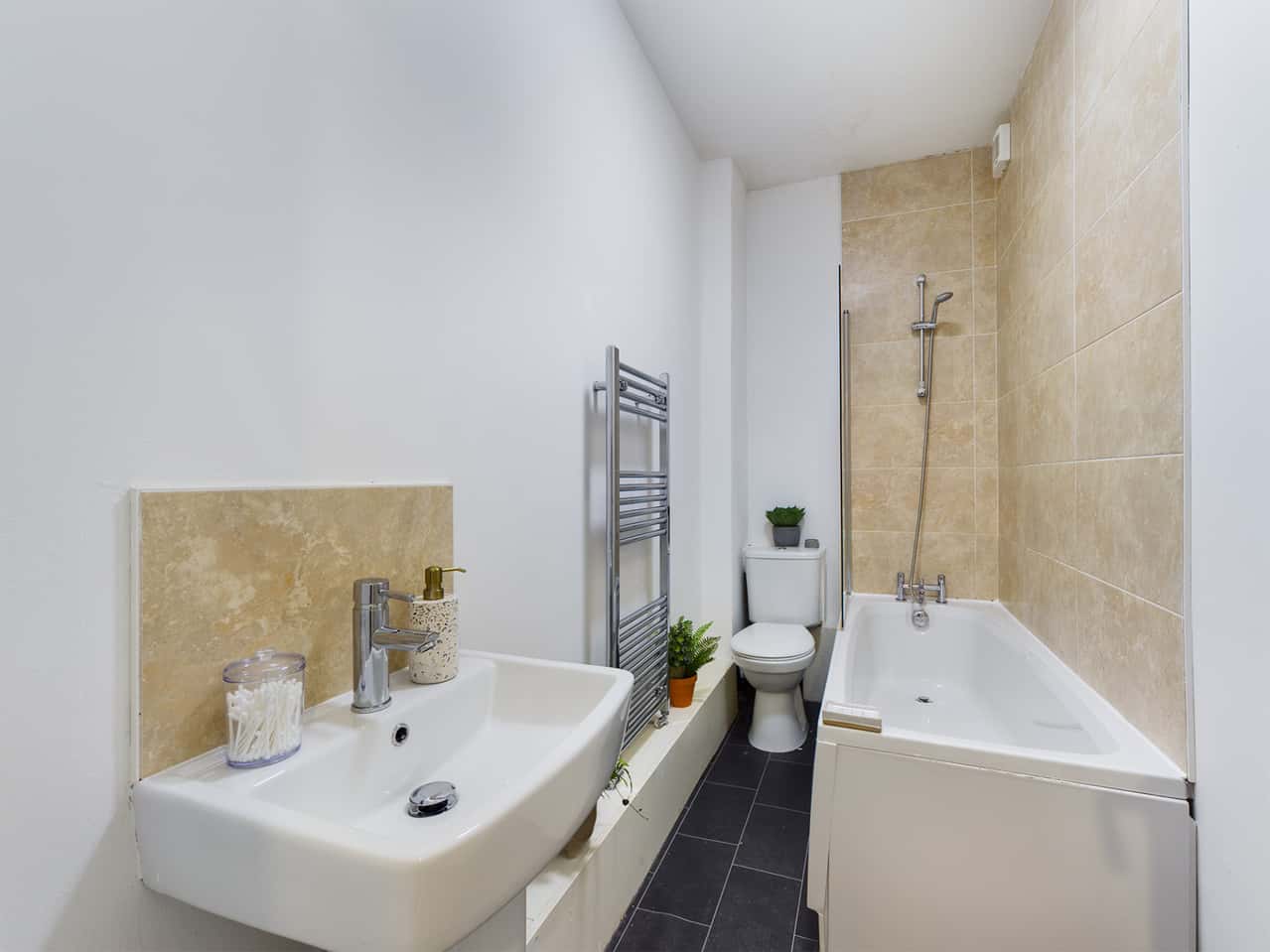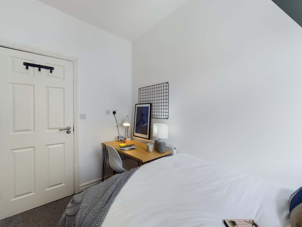 This elegantly refurbished property, features two double bedrooms with desks, comfortable desk chairs, and ample storage, accompanied by a modern bathroom. The chic living room boasts spacious sofas and a large flat-screen TV, ideal for socialising, complemented by a generous dining table for communal meals. The kitchen is equipped with modern appliances, multiple fridges, and a washing machine. Each piece of furniture has been carefully selected for maximum comfort and style.