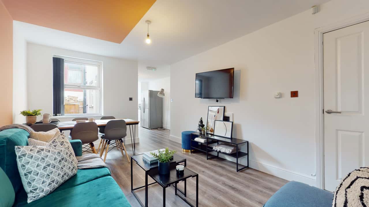 This stylishly renovated property, comprises six double bedrooms furnished with desks, comfortable desk chairs, and ample storage, alongside two modern bathrooms. The chic living room features spacious sofas and a large flat-screen TV, perfect for relaxed gatherings, accompanied by a substantial dining table for communal meals. The kitchen boasts modern appliances, multiple fridges, and a washing machine. Each piece of furniture has been carefully selected to enhance both comfort and style.