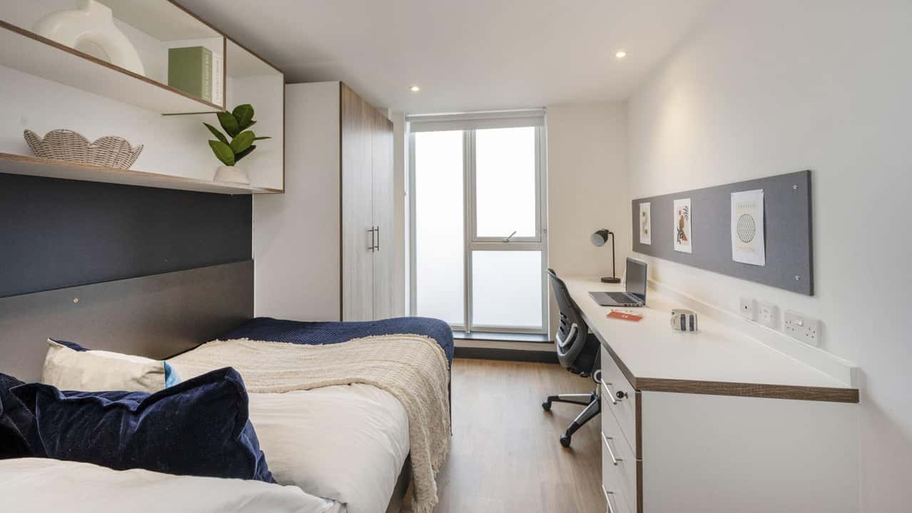 Step into your 14m² Premium En-suite and enjoy a modern living experience with comfort and style. The room features a snug ¾ size double bed with handy under-bed storage, perfect for keeping your space organised. A spacious wardrobe offers ample room for your belongings. The en-suite bathroom is equipped with a shower and WC, ensuring privacy and convenience. You will also find a full-length mirror, a study desk with drawer space, and a comfortable chair which creates a dedicated study area. In the shared kitchen, you'll find a full-size fridge freezer, an electric oven, and a 4-ring hob with an extractor. Relax in the lounge area with a sofa, and enjoy your meals around the shared dining table and chairs. Hurry up and book your room today!