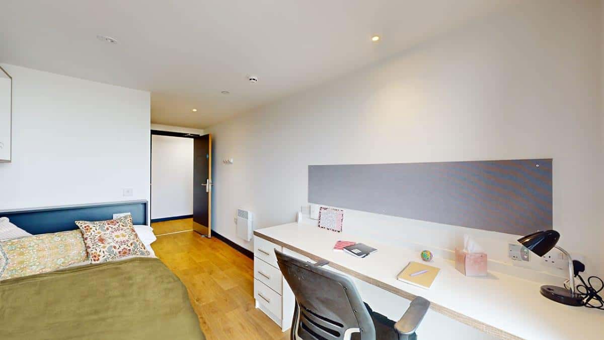 Your 8 Bed Deluxe En-suite room is a well-designed space measuring 14m². This room comes with a ¾ size double bed with under-bed storage and a wardrobe to keep your clothes neatly organised. The en-suite bathroom includes a shower and WC. A full-length mirror adds a touch of convenience, while the study desk with drawer space and chair provides a focused work environment. The shared kitchen is equipped with a full-size fridge freezer, an electric oven, and a 4-ring hob with an extractor. Enjoy downtime in the lounge area with a sofa and share meals at the communal dining table and chairs. Don’t miss out - book your studio today!
