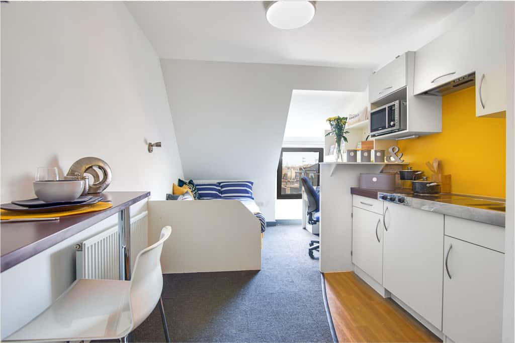 Our Bronze Studio option measures approximately 17 sqm in size and features a comfortable small double bed, ample storage for all your belongings, Wi-Fi enabled study space, a private bathroom and a fully fitted kitchen.The studio is well equipped with all modern amenities required for an easy and comfortable stay.The apartment is completely your own, allowing you privacy and freedom. Study for your exams without any distractions, prepare your meals in the kitchen and relax in the comfort of your own room. Book now for the next academic year!
