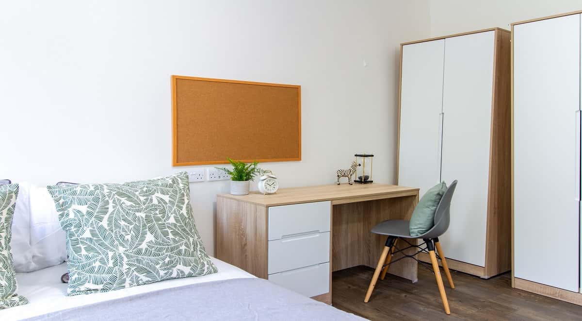 A spacious self-contained shared studio measuring approx 25-27m² with two 3/4 beds in the same studio. Grab the chance to book this with your friend. All of our Gold Twin Studio have a private kitchenette and a modern en-suite bathroom as well as study desks and plenty of storage. Have a chance to live with your best friend in the same room, each with a bed to themselves!