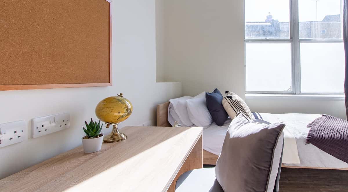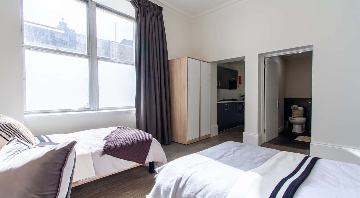A spacious self-contained shared studio measuring approx 23m² with two single beds. All of our Bronze Twin Studio have a private kitchenette and a modern en-suite bathroom as well as study desks and plenty of storage. Have a chance to live with your best friend in the same studio, each with a bed to themselves!