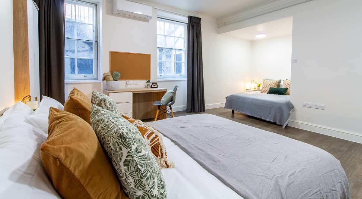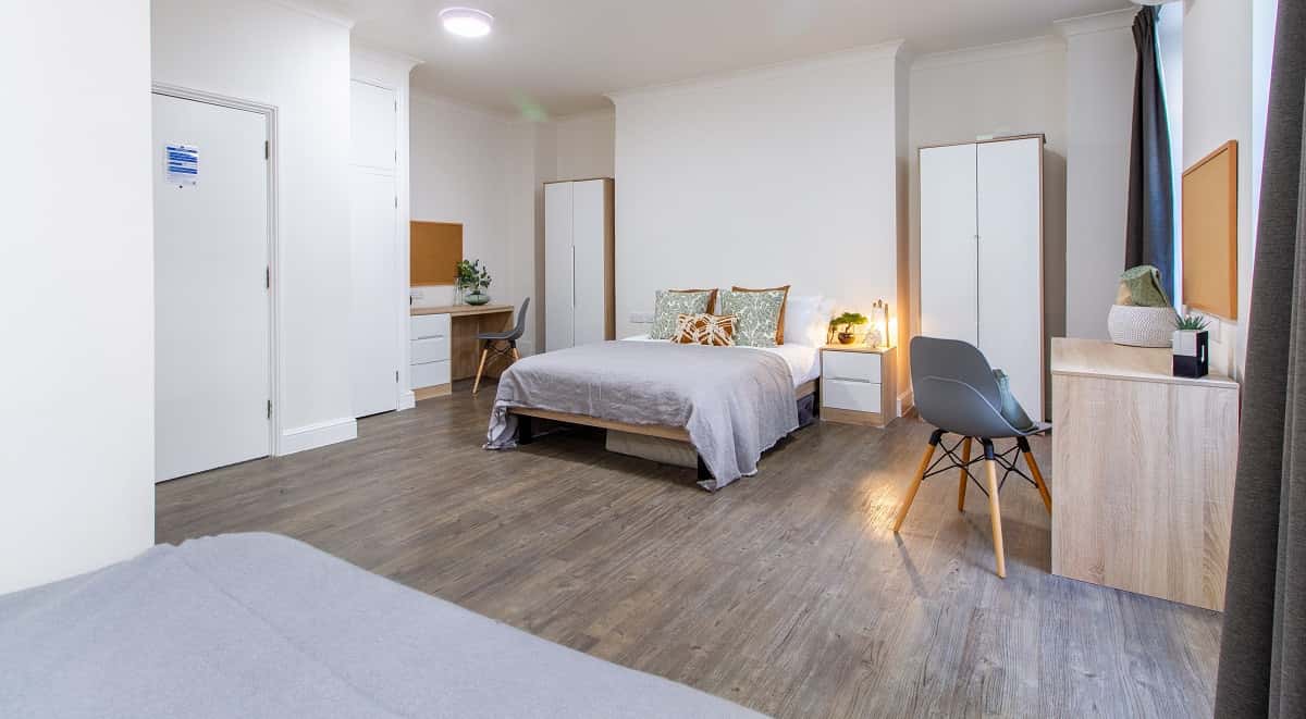 The Platinum Twin Apartment is the largest room in the building measuring 52m², with two double beds in the large, shared room. You will be sharing the room with a room mate or have a chance to live with your friend in the same room if you decide to book together. The apartment is fitted out with contemporary furniture and with a large private kitchen with integrated appliances and a modern ensuite bathroom, the apartment is the height of luxurious student living. With unlimited 100Mbps wifi and newly refurbished common areas, outdoor courtyard, comfortable snug and on site laundry. Available for single occupancy too.