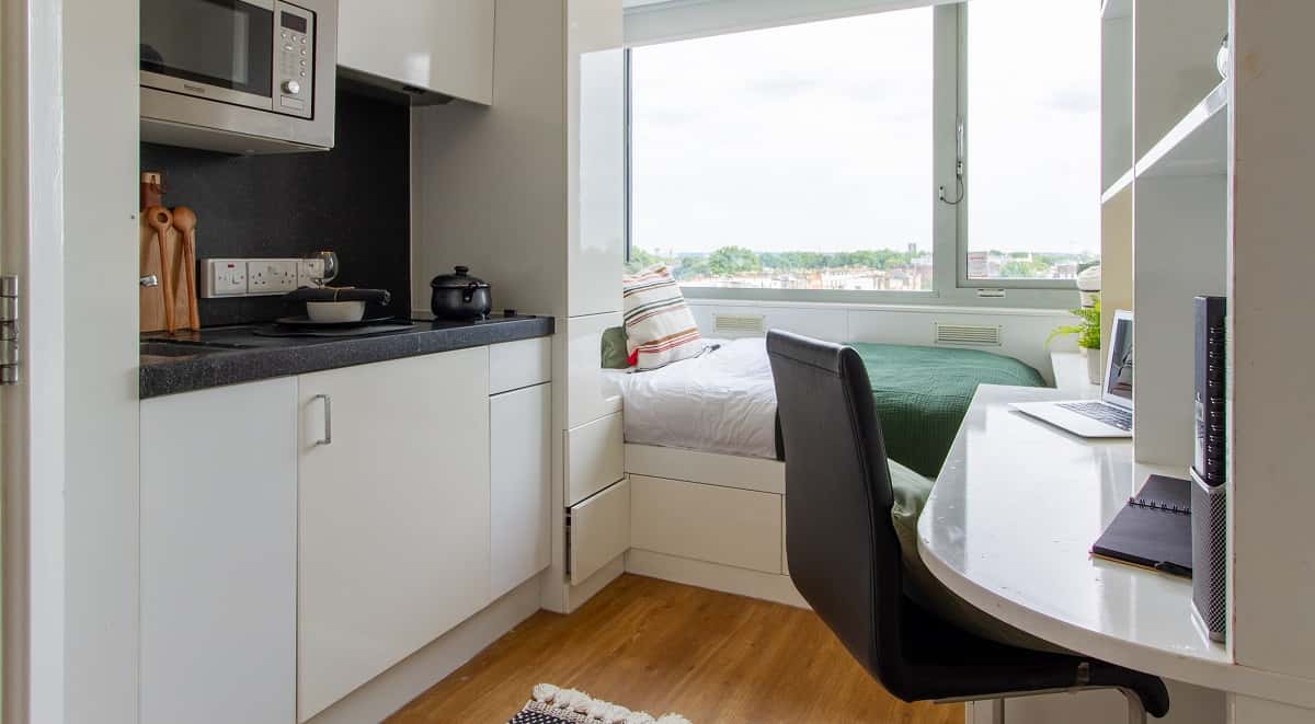Our comfy Silver Studio measures around 12.5 m² with a single bed, perfect to sink into after a long day of studying, an ensuite bathroom and a private kitchenette. There’s also plenty of generous storage with a study desk and chair so you can crack on with your uni work. Ready to chill? Your room has a TV and up to 1Gbps WIFI as well as access to the comfy lounge area, it’s time to relax!