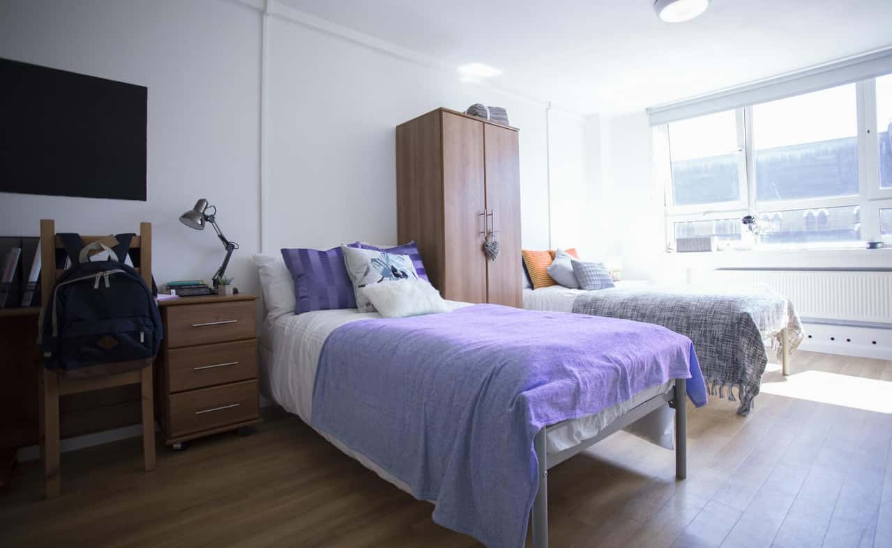 Our Junior Twin Studio measuring 18m² is ideal to share with your pals, with two comfy ¾ beds to snuggle into after a long day at uni! You’re bound to feel right at home in no time with your very own shared en suite bathroom. Get ready to sit at your very own study area when you need to crack on with uni work and enjoy the peace and quiet. There’s also a handy wardrobe for all your belongings, and 100Mbps WIFI throughout the building. The bright airy windows give your studio a spacious yet cosy feel, equipped with modern décor for that super cool aesthetic. Feeling hungry? Rustle yourself up something delicious in your very own kitchenette and practice your culinary skills!