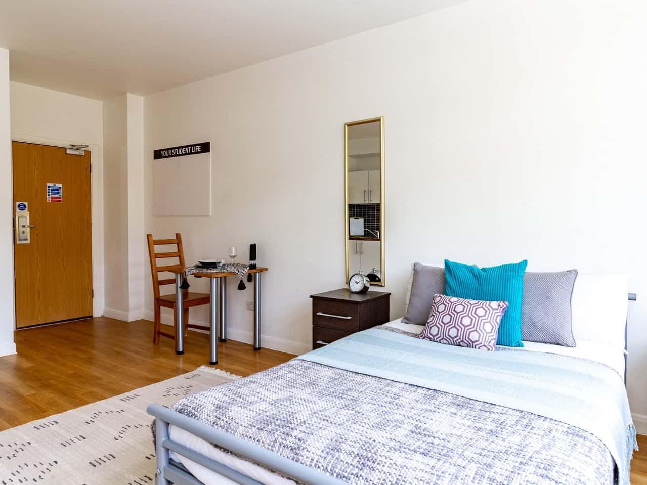 Our Gold Studio rooms are the ultimate choice for students looking for a self-contained living space, you’ll have everything you need in one place. From your own double bed with a TV to your fully equipped kitchen space to your en-suite bathroom. There’s plenty of room if you want to invite friends over and cook up something tasty! Not to mention, if you need to crack on with university work, there’s plenty of desk space and 100Mbps WIFI throughout the building. There are also large windows in each room which look out onto the picturesque canal or our lovely courtyard area, depending on the room facing. If you want to make some friends then head to our common room, the ideal space to socialise. Why not go Gold today? Room sizes vary per room and floor arrangement, please get in touch with us if you want to discuss specific sizes.