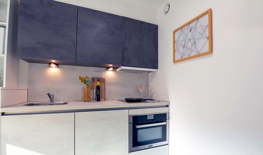 Experience a luxurious living experience in our Premium studio with the room size of 16.37 sqm. It features comfortable furnishings, a modern kitchen, and a dedicated study area. You can also make the most of the communal lounge, fitness studio, and study rooms available within the building. Book your studio today!