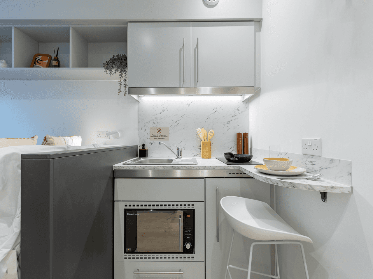 Each Bronze studio showcases a 3/4 double bed, in-room air conditioning ensuring you are always in control of your own comfort, a modern kitchen and a private ensuite bathroom all delivered in a modern and sleek specification. Located on the Lower Ground Floor, Ground Floor and 1st Floor, our Bronze Studios offer 12.53 – 18.08 sqm of luxury living. In addition to this, you can enjoy the convenience of all the communal spaces within the building. Book your Bronze Studio now for a premium student living experience!