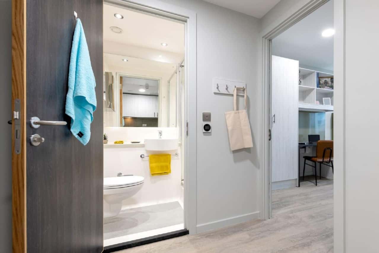 The 2-Bed Apartment is a great option for students who prefer shared living with added privacy, offering 30.37m² to 33.77m² of space across the ground to third floors. Each bedroom comes with a ¾ size double bed with under-bed storage, a study desk with chair, and a wardrobe, while the shared kitchen includes ceramic hobs, a combi oven, and a fridge freezer. The en-suite shower room is shared, and the apartment is equipped with air conditioning and heating for a comfortable stay. Book your 2-Bed Apartment today and enjoy modern, shared student living!