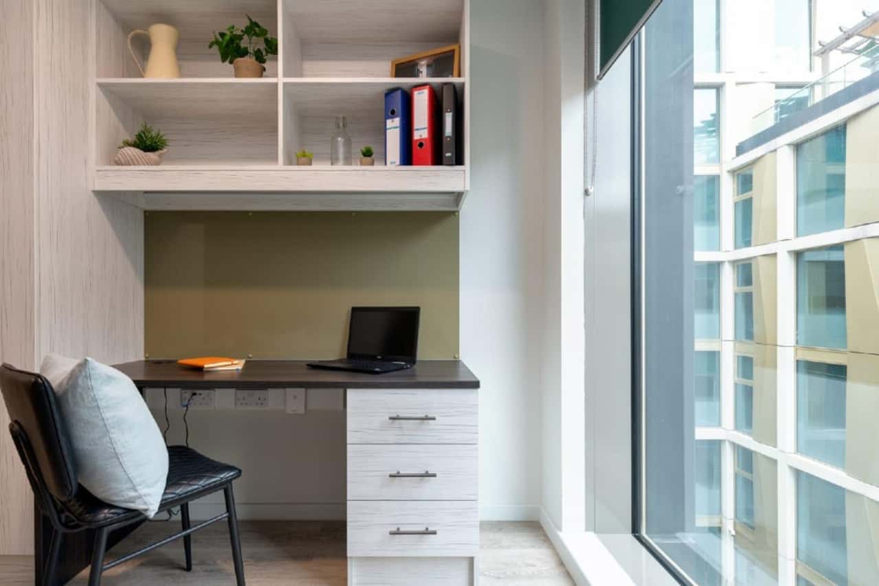 Designed for accessibility and comfort, the Accessible Studio is perfect for students who require extra space and convenience. Inside, you'll find a ¾ size double bed with under-bed storage, a study area with two desks and chairs, a wardrobe, drawers, shelves, and a magnetic board. The kitchen, equipped with ceramic hobs, a combi oven, and a fridge freezer, also includes a dining table and chairs. The private en-suite shower room is designed for ease of use, while air conditioning and heating ensure comfort all year round. Book your Accessible Studio today for a comfortable and well-equipped student home!