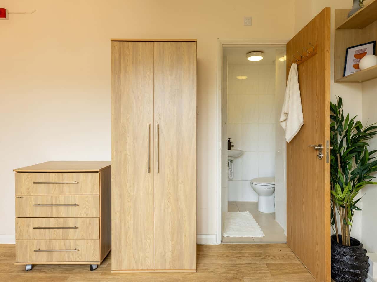 The Standard Studio at Brooke Hall is perfect if you want your own space without going over budget. This studio measures approximately between 14 to 16 sqm and has got everything you need: a comfy single bed with underbed storage, a private bathroom, a wardrobe, equipped kitchen, desk, chair, and chest of drawers. There’s also ample storage for textbooks, clothes, and the random stuff you’ll probably accumulate throughout the year. Every room comes with free internet access, so you’re always connected whether you’re on a group call or streaming your favourite show.