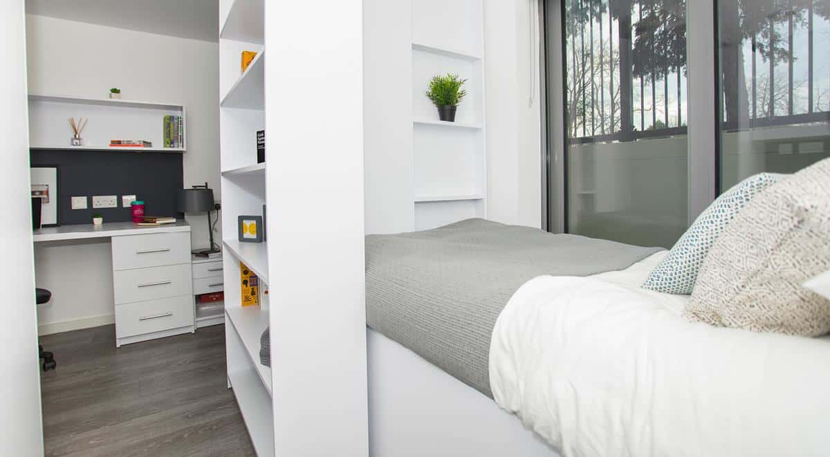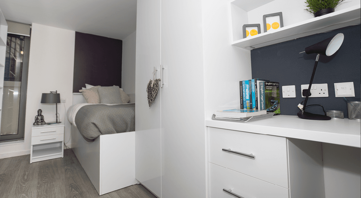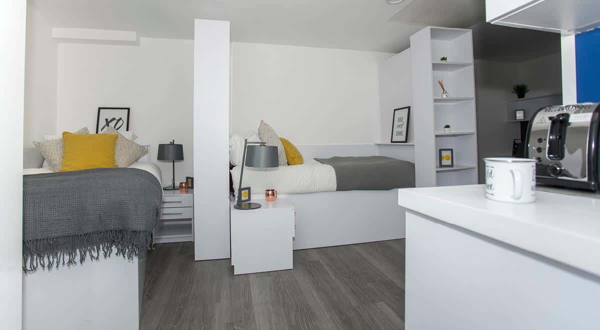 At a spacious 19 sqm, our fully furnished Twin Studio is designed for comfortable dual occupancy, making it a great choice for friends, siblings, or couples who want to share their uni experience. Each studio comes with two beds, two desks with chairs, and plenty of personal storage including wardrobes, drawers, and blinds, so you’ll each have your own space to stay organised.