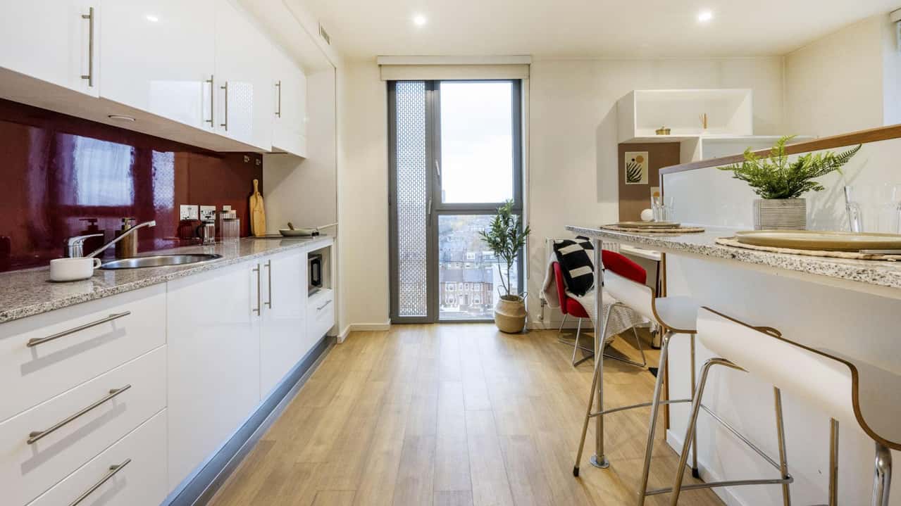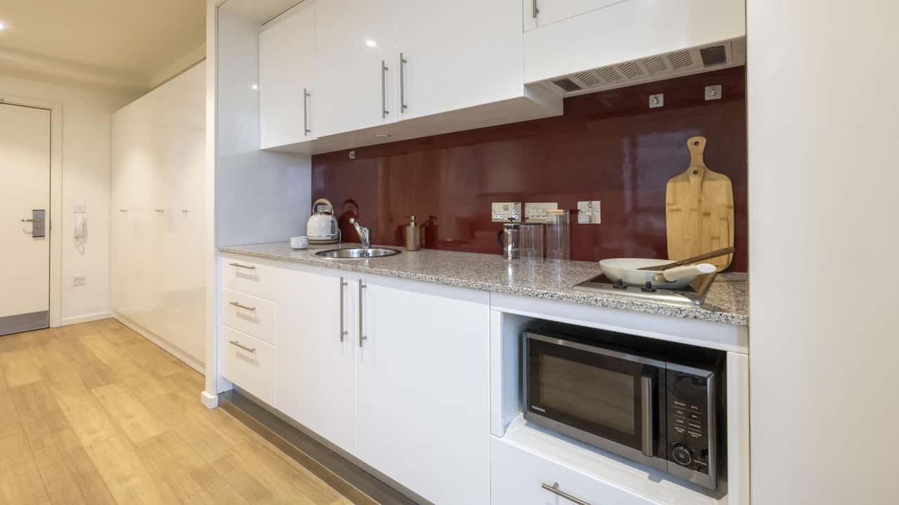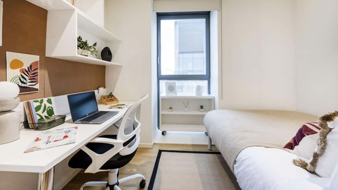 Your private room is fully self-contained, featuring a plush bed, personal study zone, a modern en-suite bathroom, a well-equipped kitchen, and ample storage. The raised position provides a superb view of the city below for quiet reflection following a long day of studying.