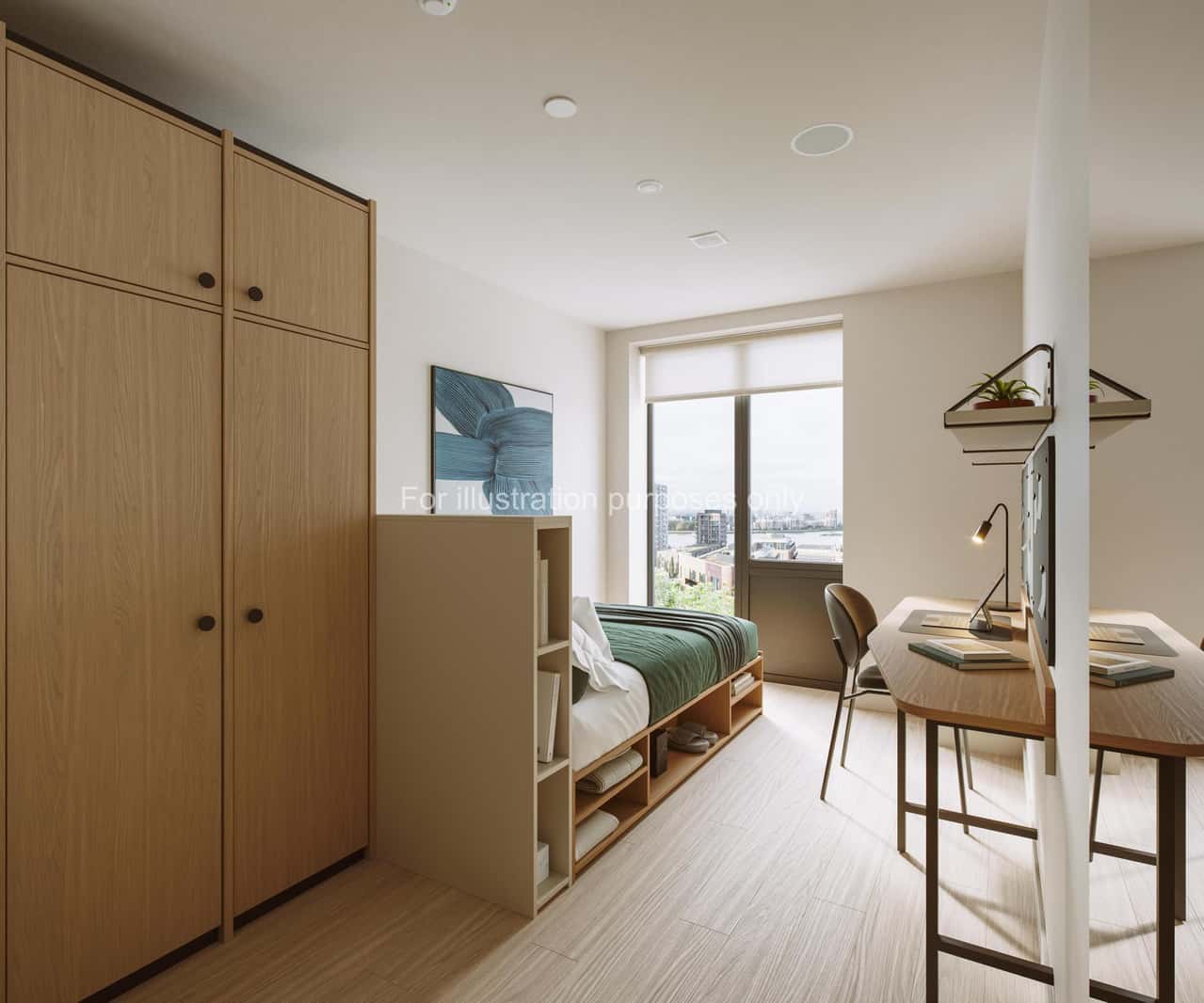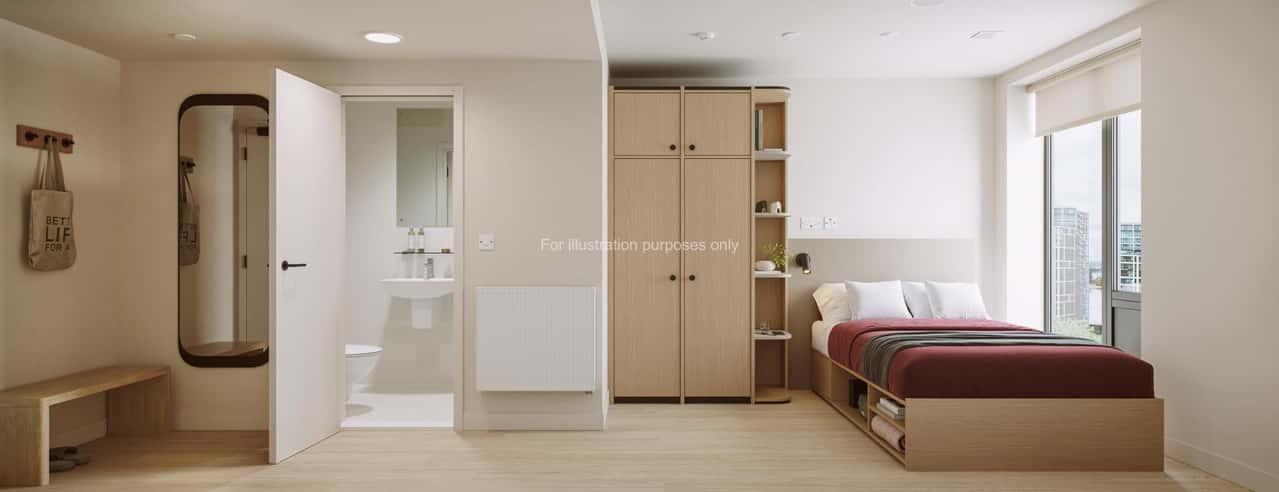 Discover a refined student living experience in the Classic Ensuite on floors 8-13 of Press House, offering a comfortable floor plan of between 12.7m² and 13.8m². This chic room is furnished with a plush bed, ample storage, and a private en-suite bathroom. It serves as a personal sanctuary for rest and study, while the shared kitchen and dining area provide opportunities to socialise.
