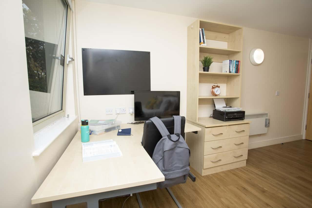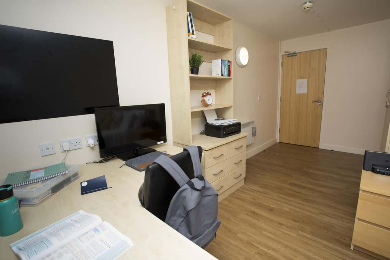 Spacious bedroom with a ¾ double bed, En-suite bathroom, study area and wardrobe. The shared area includes a lounge and kitchen area and up to 100Mbps WIFI throughout.