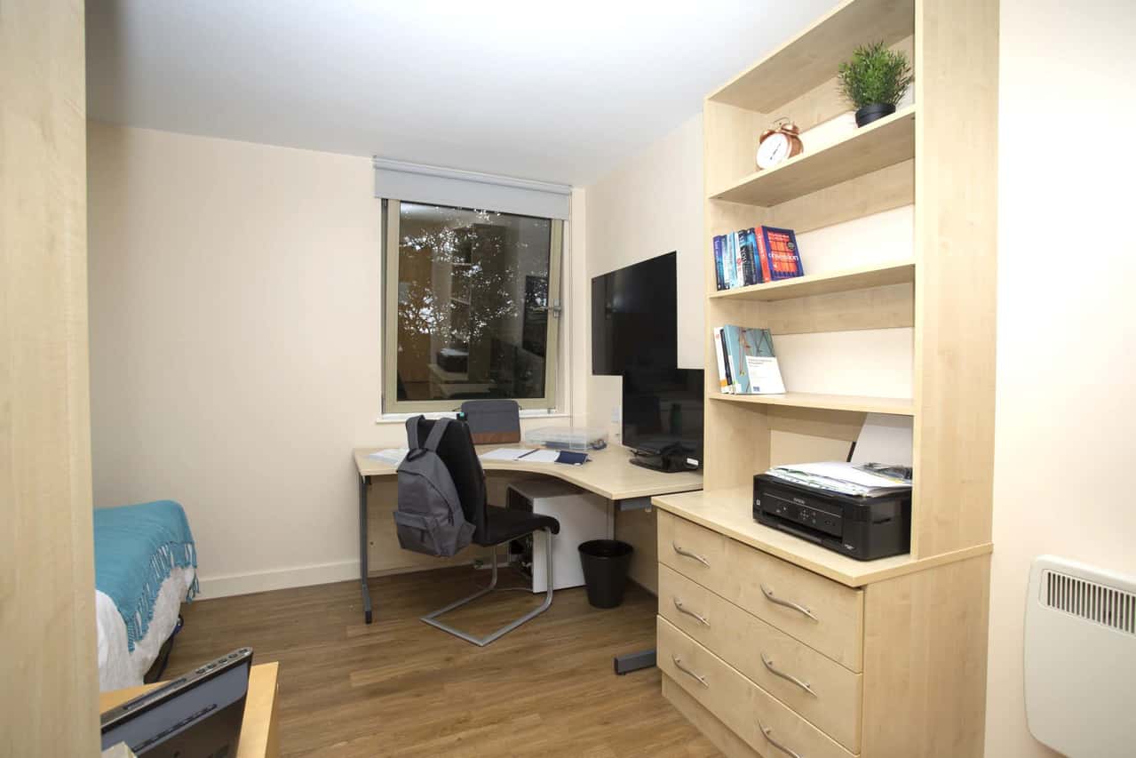 Spacious bedroom with a ¾ double bed, En-suite bathroom, study area and wardrobe. The shared area includes a lounge and kitchen area and up to 100Mbps WIFI throughout.