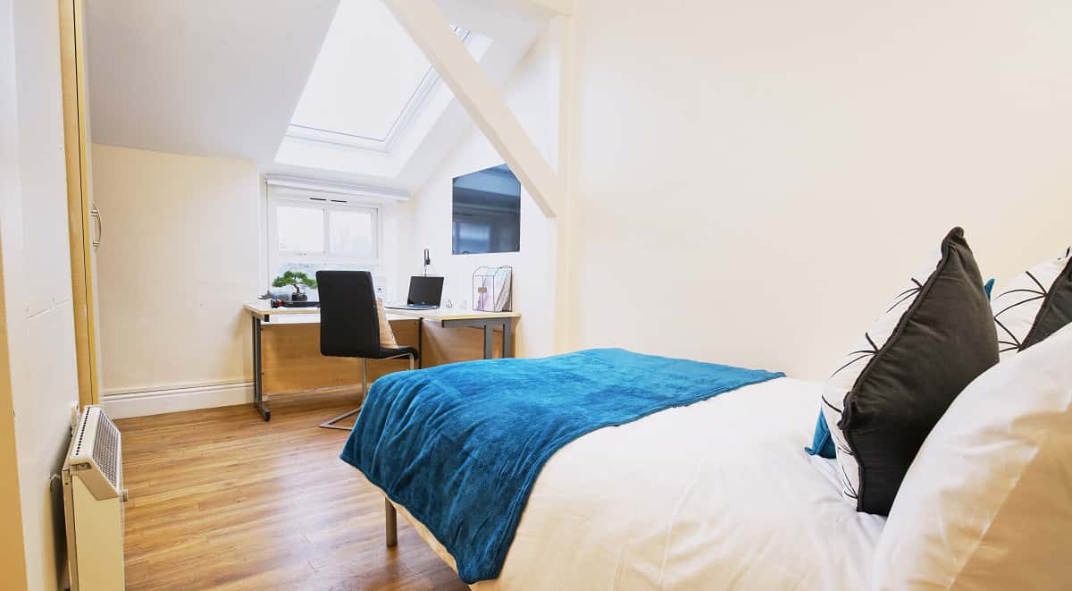 Spacious bedroom with a ¾ double bed, study area and wardrobe. The shared area includes a lounge and kitchen area and up to 100Mbps WIFI throughout.