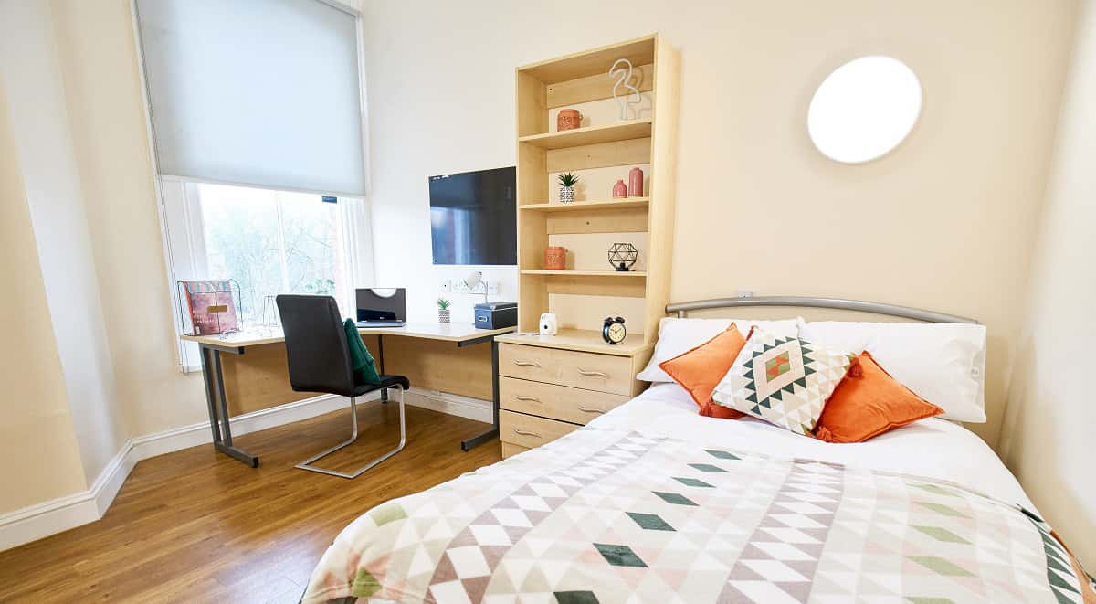 Spacious bedroom with a ¾ double bed, study area and wardrobe. The shared area includes a lounge and kitchen area and up to 100Mbps WIFI throughout.