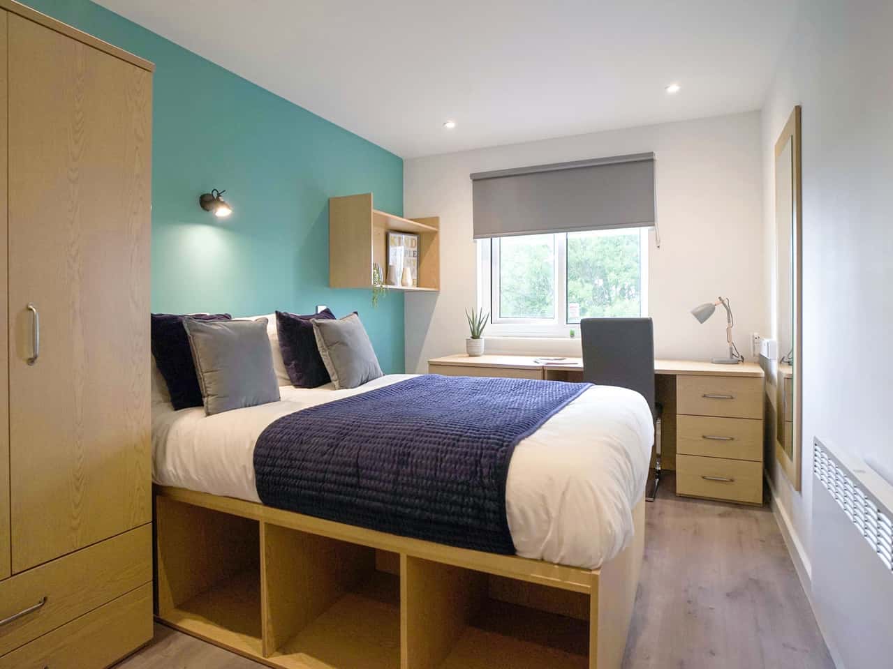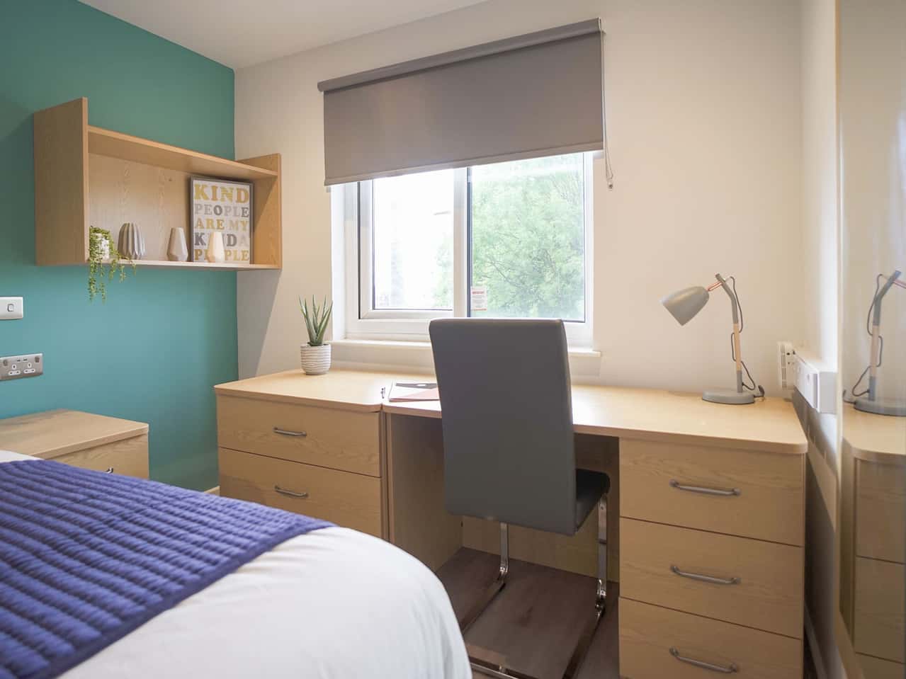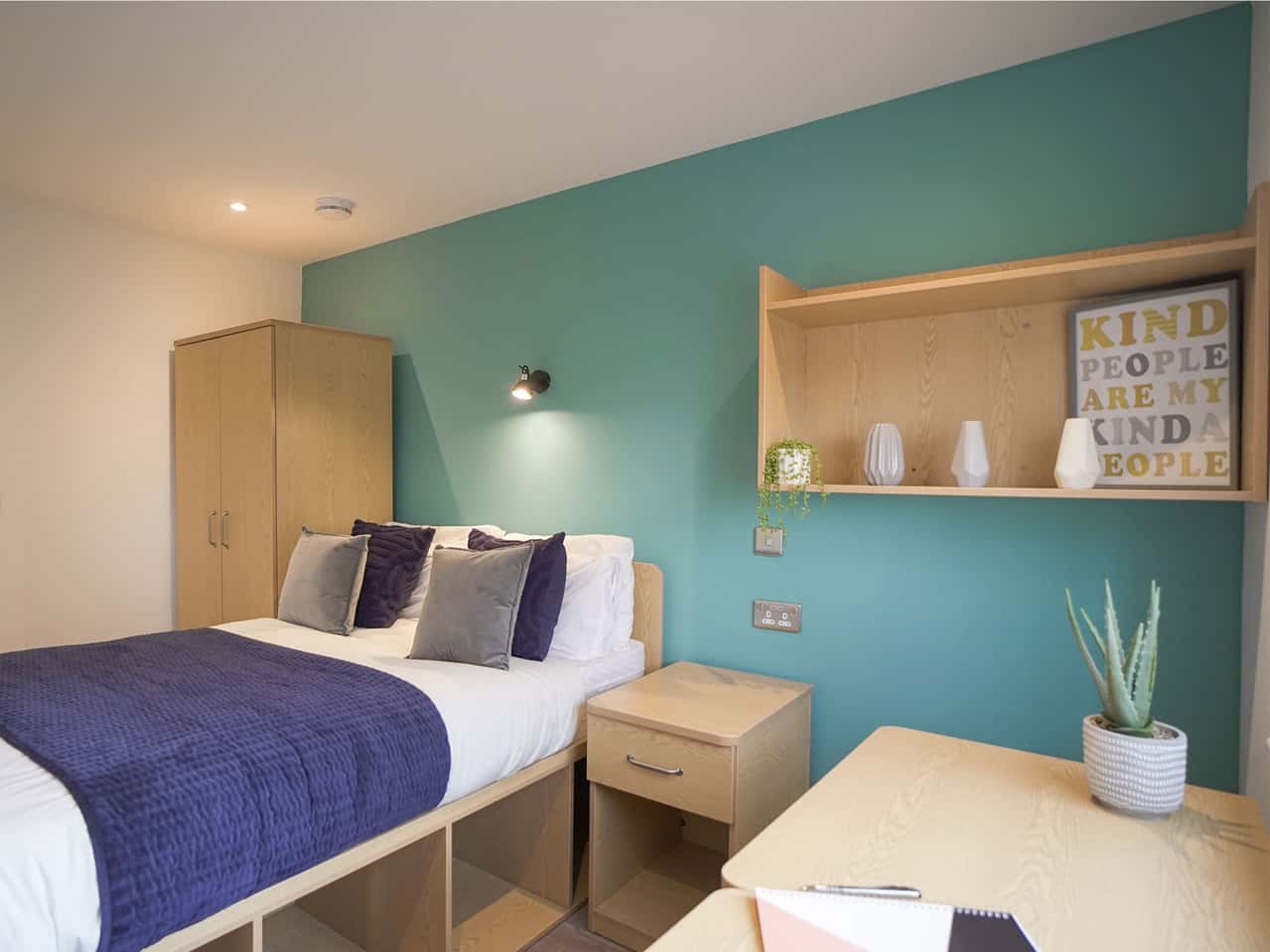 Our Gold Ensuite Plus is a newly refurbished style room. The room comes with a small double sized bed, a desk and chair, a wardrobe, drawers, and a bedside table. You’ll also have your own en-suite bathroom for more privacy. Within this cluster flat you’ll share a kitchen which has modern appliances and a breakfast bar and stools. Our shared areas also have comfy so you can chill out with your flatmates. Whilst staying with us you can make the most of the Park View common room, which has a TV and Sky.