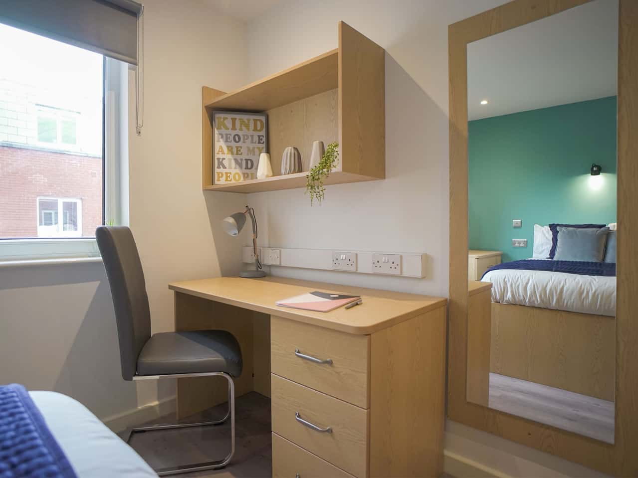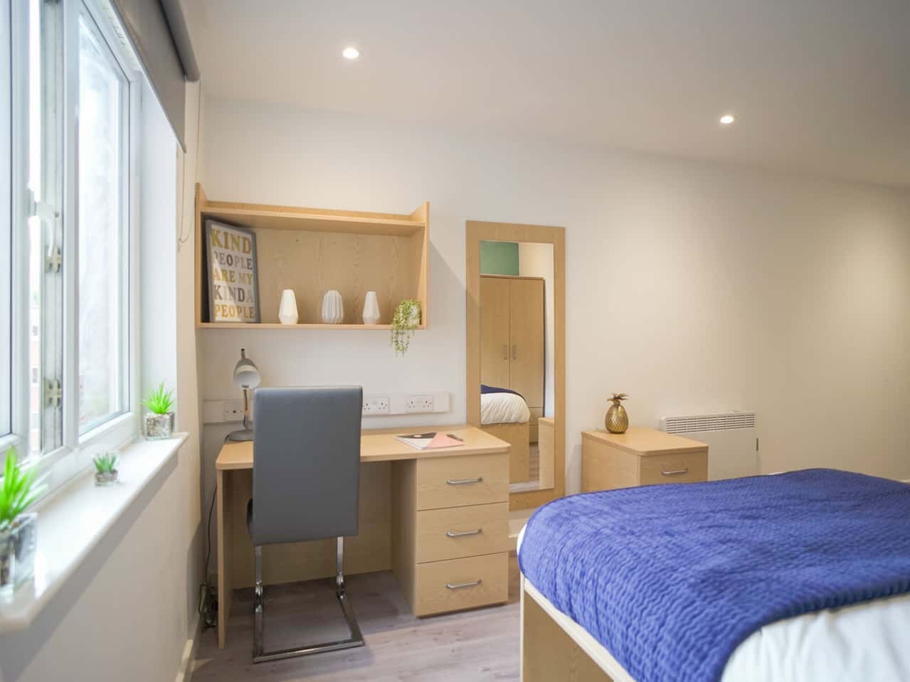 Our Platinum Plus Ensuite is a newly furbished style room which is the largest of our rooms. The room comes with a small double sized bed, a desk and chair, a wardrobe, drawers, and a bedside table. You’ll also have your own en-suite bathroom with a shower. Within this cluster flat you’ll have a communal kitchen with all the appliances you’ll need to show off your tasty meals. Our shared areas also have comfy sofas, and a breakfast bar and stools. Make the most of our 100Mbps WiFi whilst studying at your desk space! If you feel taking a break from uni work, head to Park View’s very own common room to socialise and meet new people.