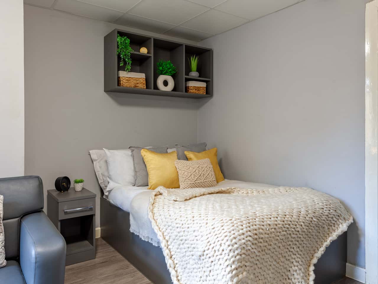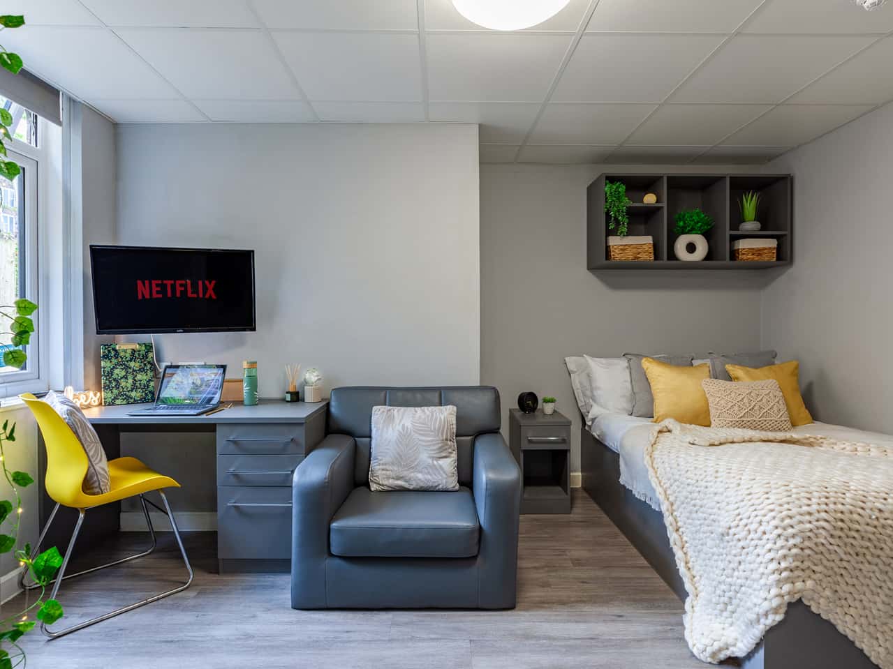 If you’re searching for your own private space where you can also make the most of a communal lounge and games room, then this room style is for you. Our Luxury Studio rooms feature a cosy 3/4 bed with underbed and overbed storage, a large desk and chair, double wardrobe, a TV, en-suite bathroom and a fully equipped kitchen. Is this the living space for you? Book with us today to live a life of luxury at Allen Court.