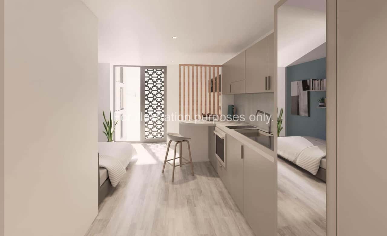 Located on the ground floor, the Accessible Studio offers between 22.3m² and 23.2m² of carefully designed space. This studio features a comfortable bed, a private ensuite washroom, and a study desk and chair tailored for ease and comfort. The cupboard with ample storage ensures your essentials are within easy reach. The private kitchen is designed to make meal preparation simple and enjoyable. This studio ensures a comfortable and accessible living experience. Book your room today!