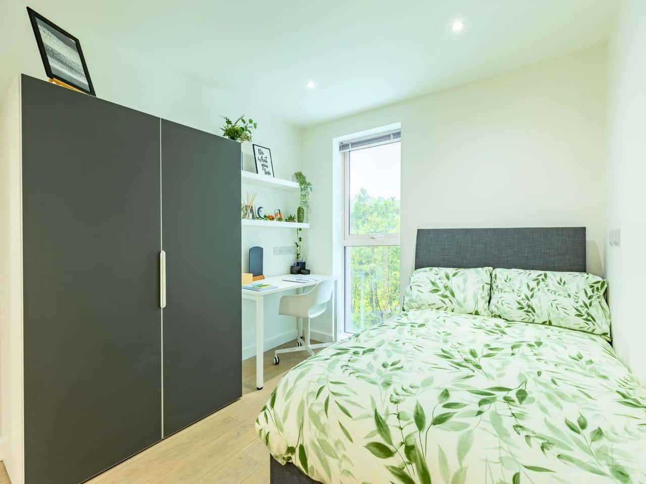 Within your deluxe studio, you’ll have your own study desk for working hard and plenty of space for all your belongings with shelving and a large wardrobe. Featuring a modern kitchenette, an ensuite bathroom and a comfy small double bed, you’ll have everything you could need. After a long day of classes, you can relax by watching TV in your studio and enjoying the amenities in the building. This studio is located on the 1st, 2nd and 3rd floor of block 4 . Sort your room for the next academic year today!