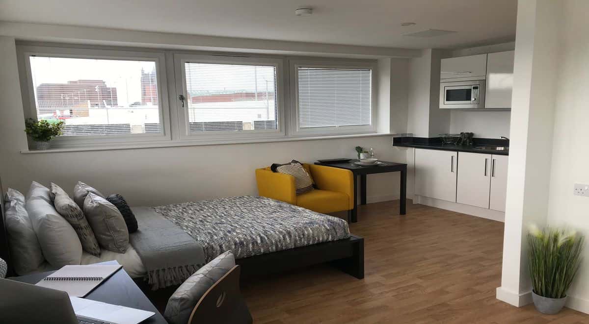 From 22m2 Premier self-contained studios are fitted with a large bed, wardrobe, chest of drawers, study desk and kitchenette. The studio en-suite is fitted with a power shower.