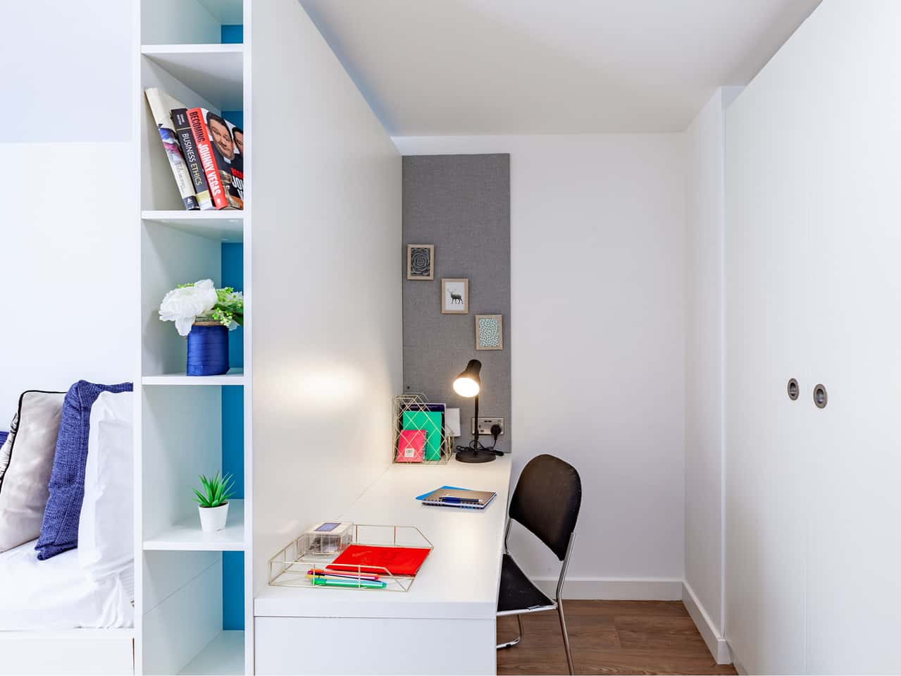 Our modern 1st, 2nd and 3rd floor Studio bedrooms measure between 18-20sqm and come with a comfy double bed with adequate underneath storage, study area with a desk and chair, and wardrobe. You can make the most of the self-contained kitchen and en-suite bathroom with all the facilities you’ll need for student living. You’ll also have your own bar table and bar stool so you can eat in style! If you want to get the best of both worlds with your own private space but also have social aspects to enjoy in Glassworks like our games room, then this is the room for you. *Room layouts are for illustration purposes. Actual rooms layouts may vary.