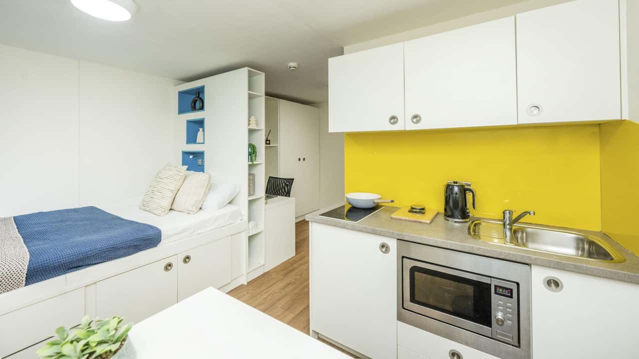Our modern Studio bedrooms come with a comfy double bed with adequate underneath storage, study area with a desk and chair, and wardrobe. You can make the most of the self-contained kitchen and en-suite bathroom with all the facilities you’ll need for student living. You’ll also have your own bar table and bar stool so you can eat in style! If you want to get the best of both worlds with your own private space but also have social aspects to enjoy in Glassworks like our games room, then this is the room for you. *Room layouts are for illustration purposes. Actual rooms layouts may vary.