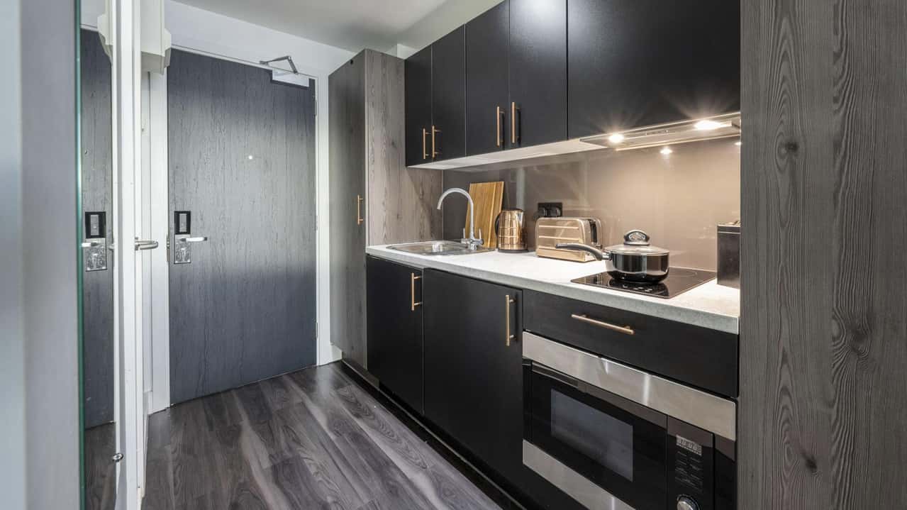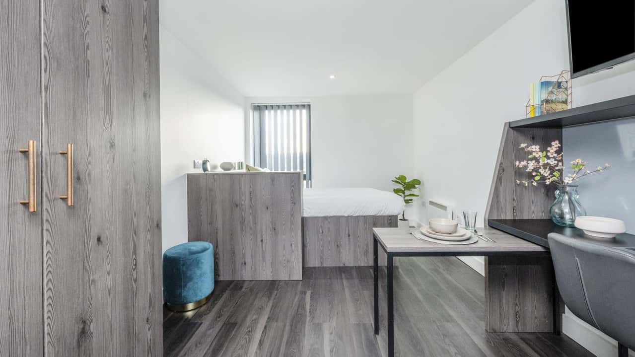 A perfect blend of functionality and comfort, the Studio is designed to make student life effortless. The comfortable bed guarantees a good night’s sleep, while the study desk and chair create a focused workspace. The modern kitchen allows for easy meal preparation, and the en-suite bathroom provides complete privacy. Whether you’re studying or relaxing, this studio offers a space tailored to your needs. Book now and enjoy hassle-free student living!