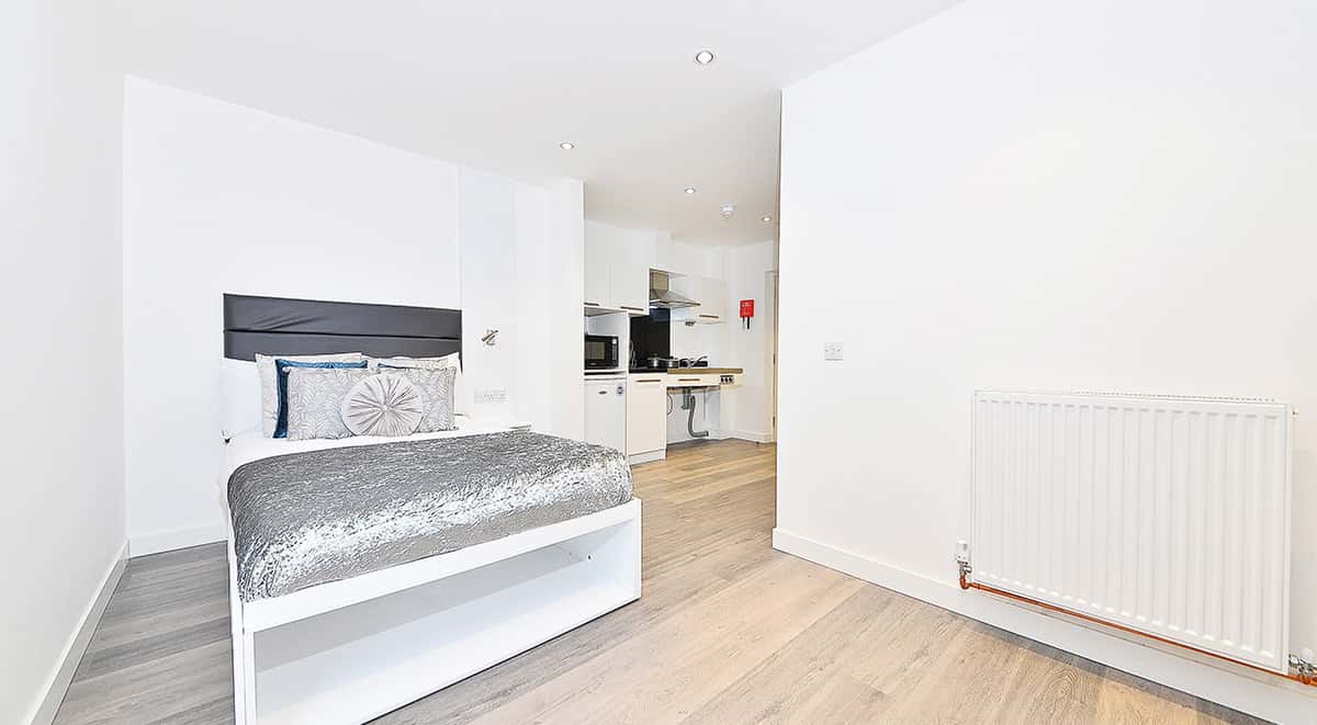 This modern Large Premium studio measures around 24.3m2 and comes with a large 3/4 size bed, study area, an ensuite bathroom, a fully fitted kitchen, a smart TV and ample storage. The shared areas include a lounge room and a communal dining room.