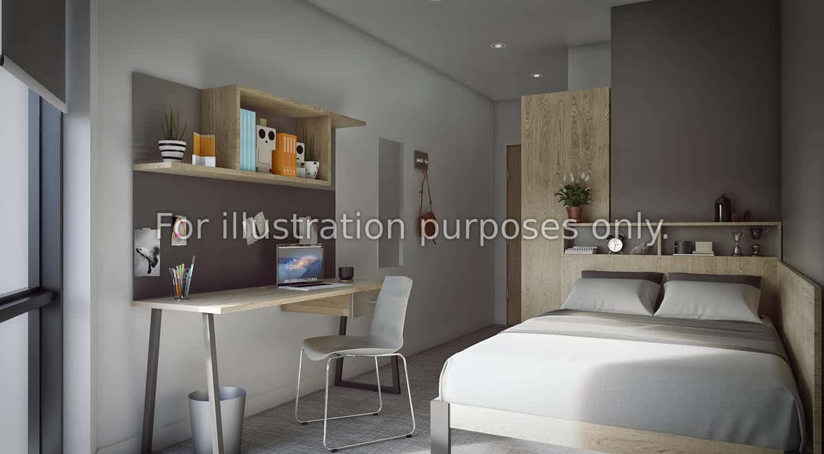 This studio room, measuring a 14.9 square metres, comes with a ¾ sized bed, study area, modern kitchenette, en-suite bathroom and ample storage. You will also have access to the amazing communal rooms in the building such as a cinema room, study room and on-site gym. Book your room today!