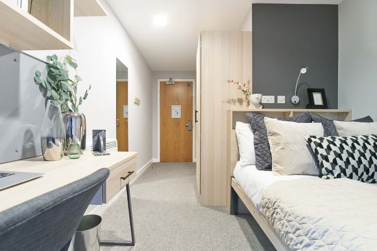 “This ensuite room, measuring a 8.8 square metres, offers a ¾ sized bed, a dedicated study area, a private bathroom, and plenty of storage. You’ll also enjoy shared kitchen facilities and wonderful communal spaces including a cinema room, study room and on-site gym.