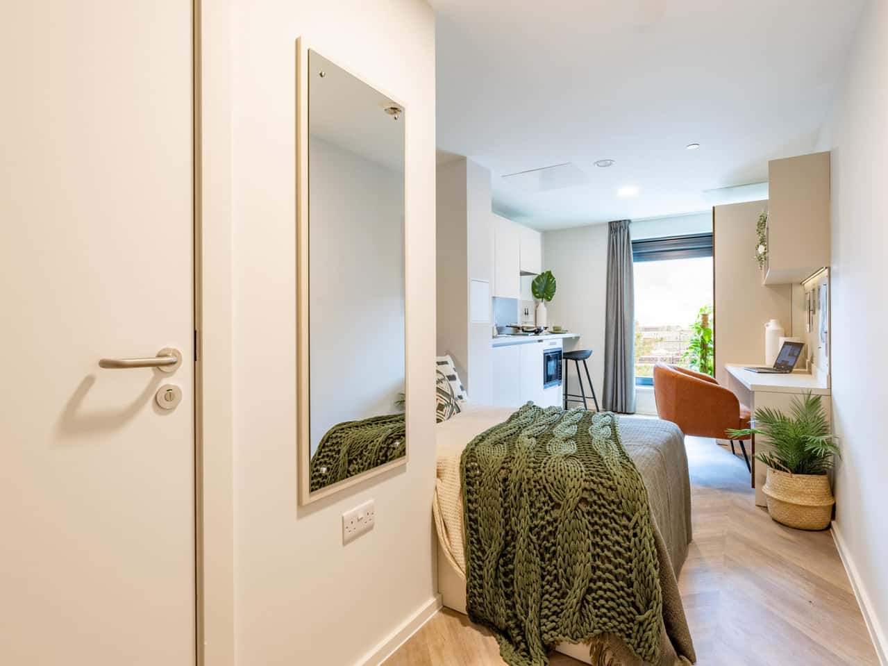 Upgrade your student living experience with our Platinum Studio rooms, available on floors 6 to 10. These rooms range from 22.3 to 22.8 square meters and offer extra space for your comfort. Each room is equipped with a private washroom with storage, a small double bed with under-bed storage, a desk, a shelf above the desk, a wardrobe, a chair, a full-length mirror, black out curtains, and a pinboard over the bed. It’s a spacious and well-equipped living arrangement with your comfort in mind. It has large communal spaces where you can cook, watch Tv and interact with your flatmates. Book your studio today!