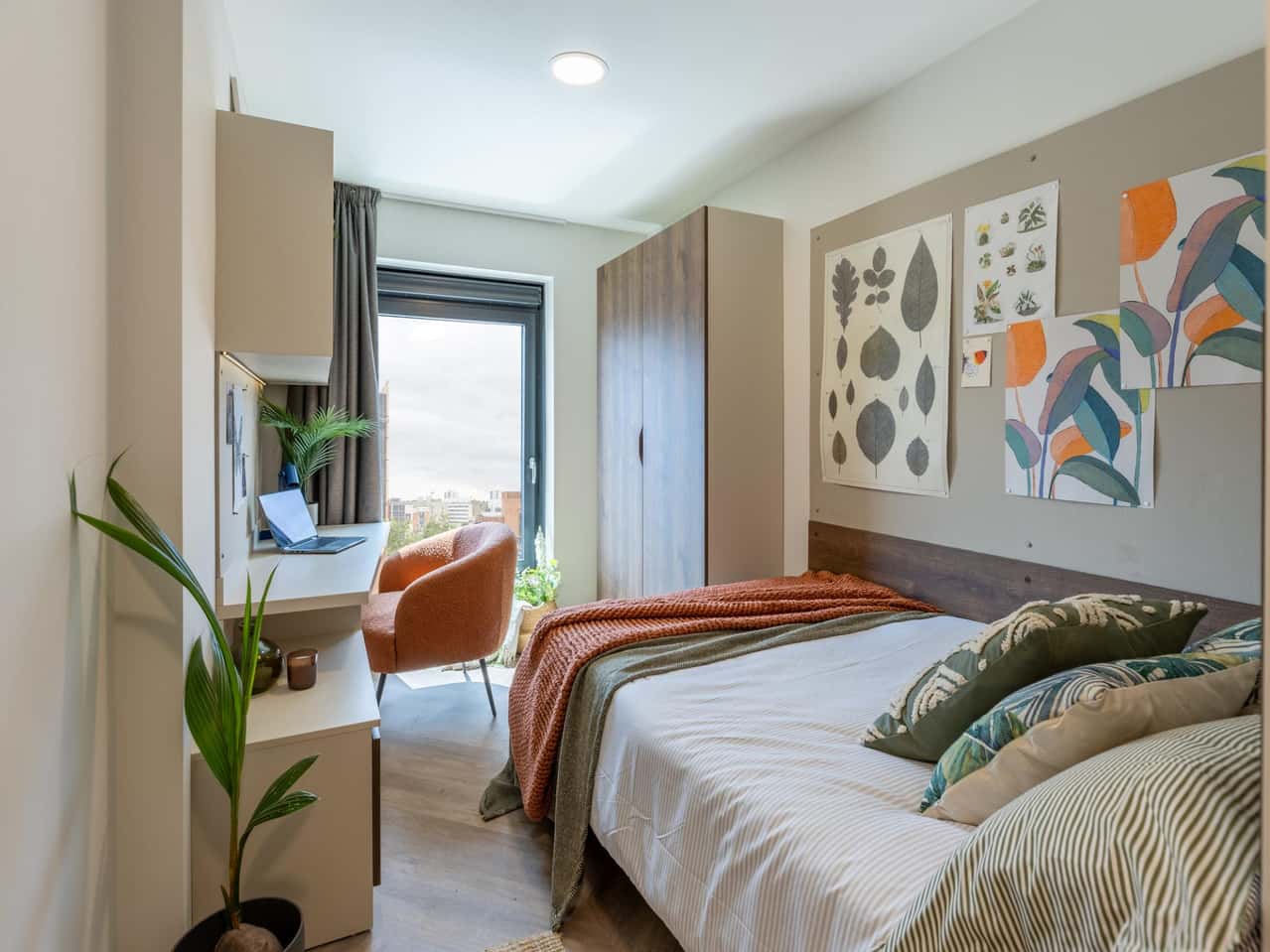 Our Platinum Ensuite rooms in a 5-bed cluster, Available on floors 1 to 9, these rooms range from 13.3 to 13.7 square meters We offer these rooms facing the North. Each room is equipped with a private washroom with storage, a small double bed with under-bed storage, a desk, a shelf above the desk, a wardrobe, a chair, a full-length mirror, black out curtains, and a pinboard over the bed. It’s a spacious and well-equipped living arrangement with your comfort in mind. The communal areas are fully furnished, we even provide you and your flatmates with a new TV and provide excellent spaces for both cooking and socialising with your fellow flatmates. Book your room now!